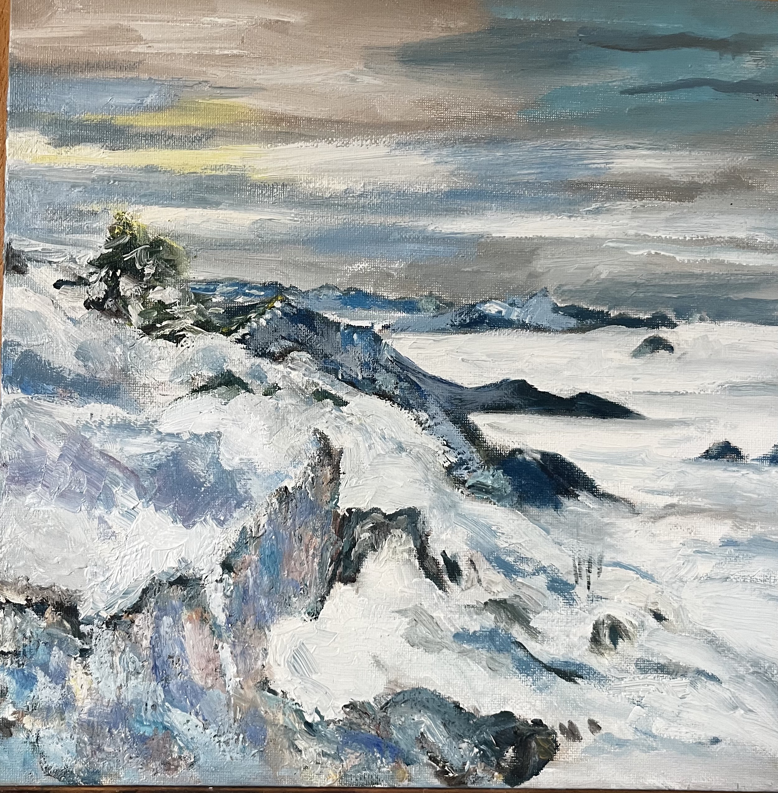 Hier eine kleine Ansicht aus dem Langlauf-Eldorado Leutasch in Österreich. Es zeigt die Hohe Munde, etwas wolkenverhangen. 30 x 40 cm. Der nächste Ölmal-Termin ist am Sonntag, den 26.1.2025 in der VHS Fürstenfeldbruck von 10 - 16 Uhr. Es sind noch Plätze frei. Sie können online reservieren.