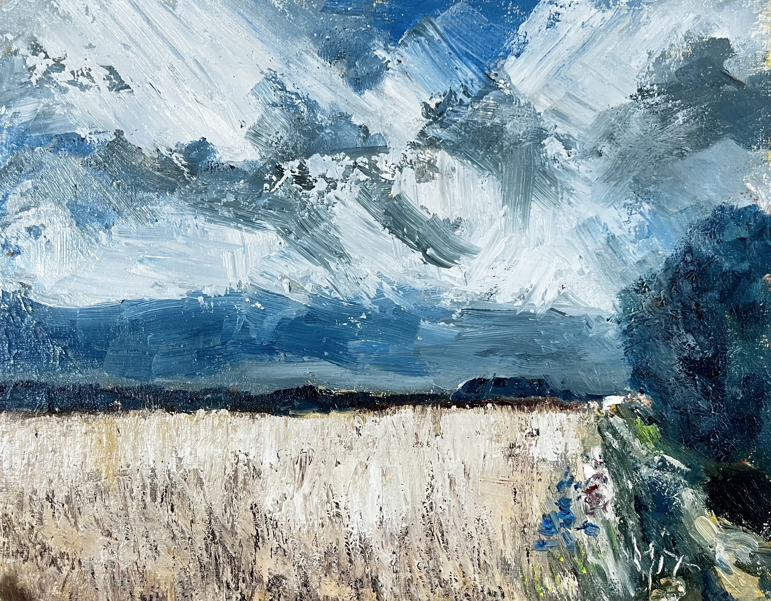 Nach dem Gewitter. In der Nähe von Nebel. Das Kornfeld wurde etwas in Mitleidenschaft gezogen. Noch etwas mit dem Shaper nachbearbeitet. Öl, Malplatte, 26 x 30 cm.Das Original ist etwas heller.