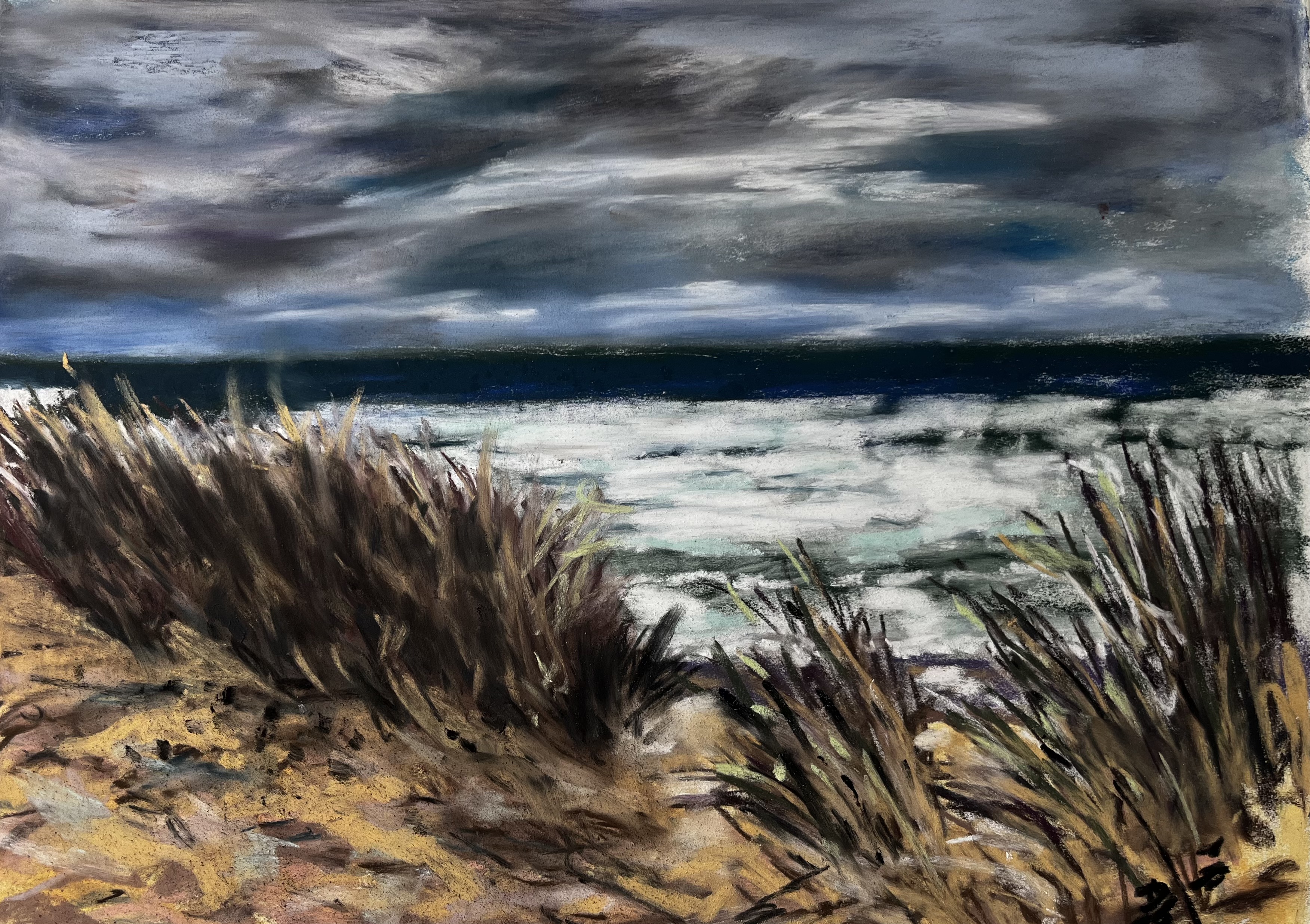 Kleiner Dünenabschnitt bei Carcans Plage. In der Nähe von #bordeaux in Frankreich. Der Herbst ist nun streng eingetroffen. Softpastell, Pastelmat, 30 x 40 cm.