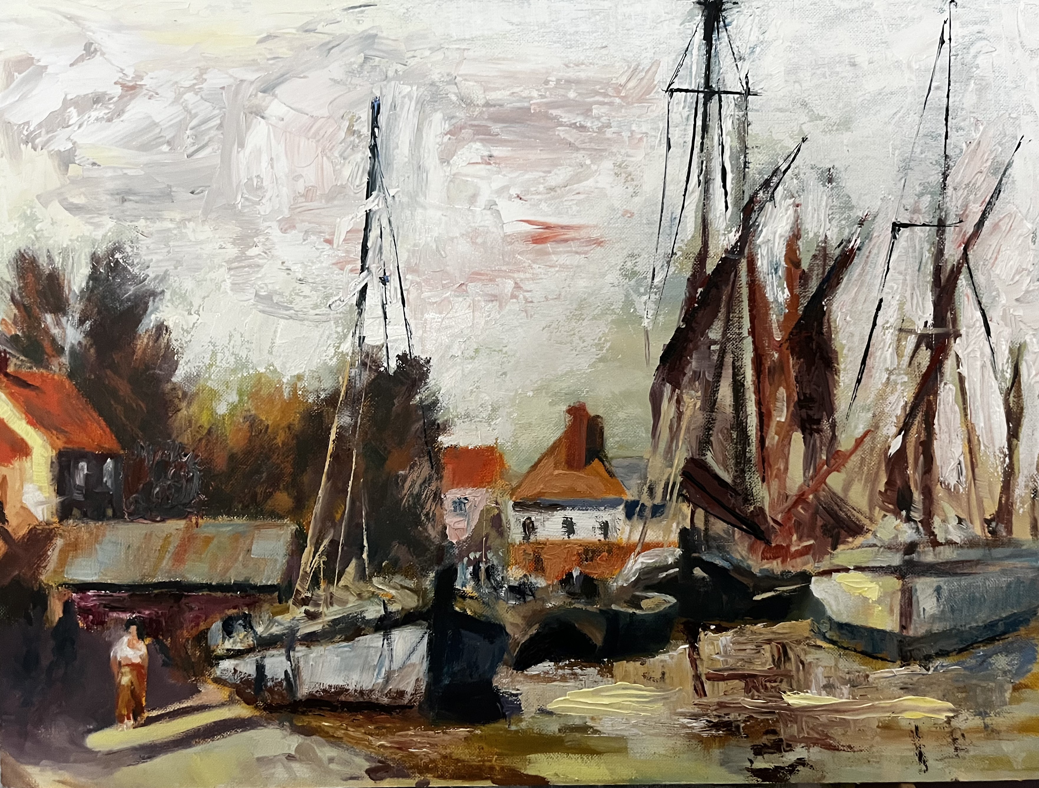 „This oilpainting was inspired by Seago, a British painter of the last century. You can see some old ships on the River Thames“.