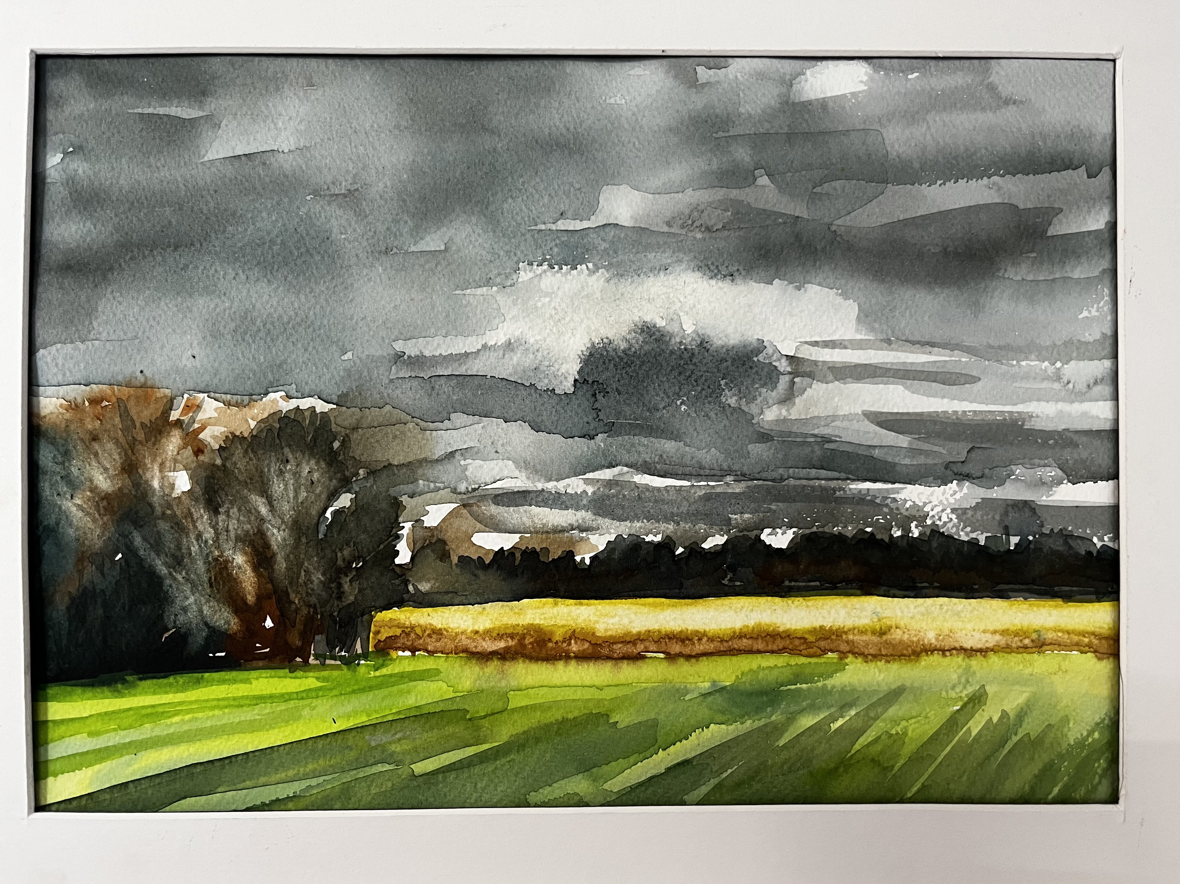 Gerade noch das letzte Maisfeld in Germering erwischt. Die Mähmaschine ist schon zu sehen. Regnen ist auch schon im Anmarsch. Expressionistische schnelle Darstellung der Szenerie in Aquarell, 30 x 40 cm. 340 Gramm.