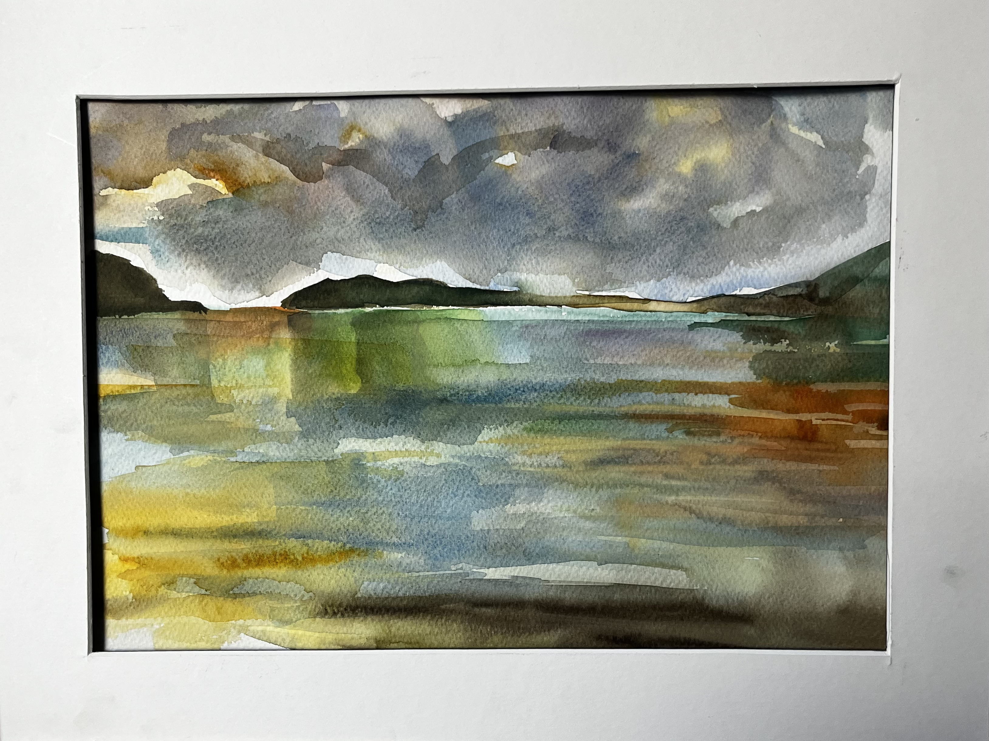 Eine kleine Impression aus der Bretagne. In der Nähe von Dournanez, Finistere. Ein Sonnenuntergang nach dem Sturm! Der Umriss der kleinen Insel Ilsalgren mit ihren stattlichen ca. 1000 qm. Die Farben sind ein bisschen krass, es sollte aber etwas an Nolde erinnern. Die Pinselführung war sehr großzügig. Aquarell, 300 Gramm, Arches.30 x 40 cm.