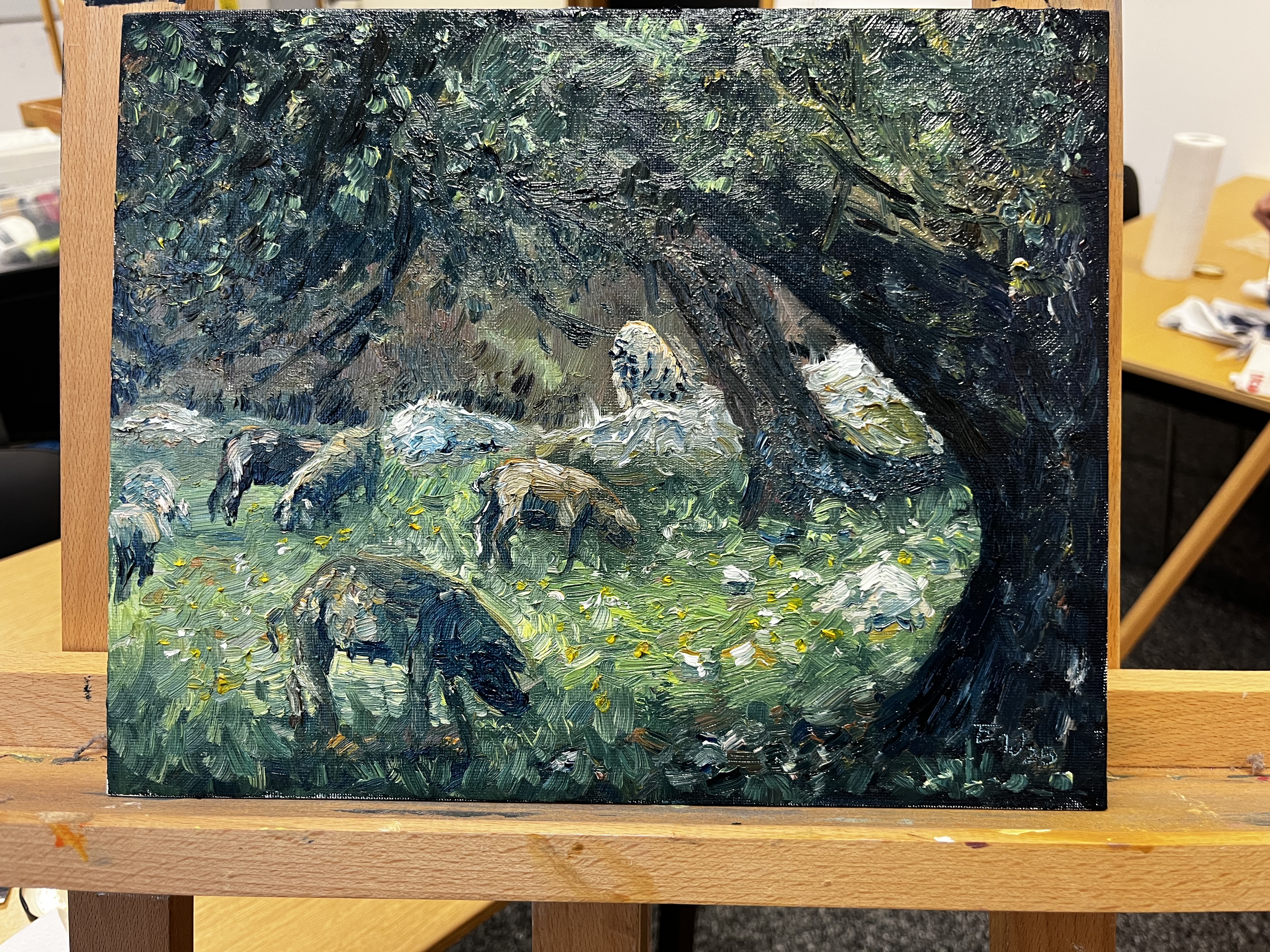 Titel von mir: „Take a break“, 30x40 cm, Öl, Malpappe“.