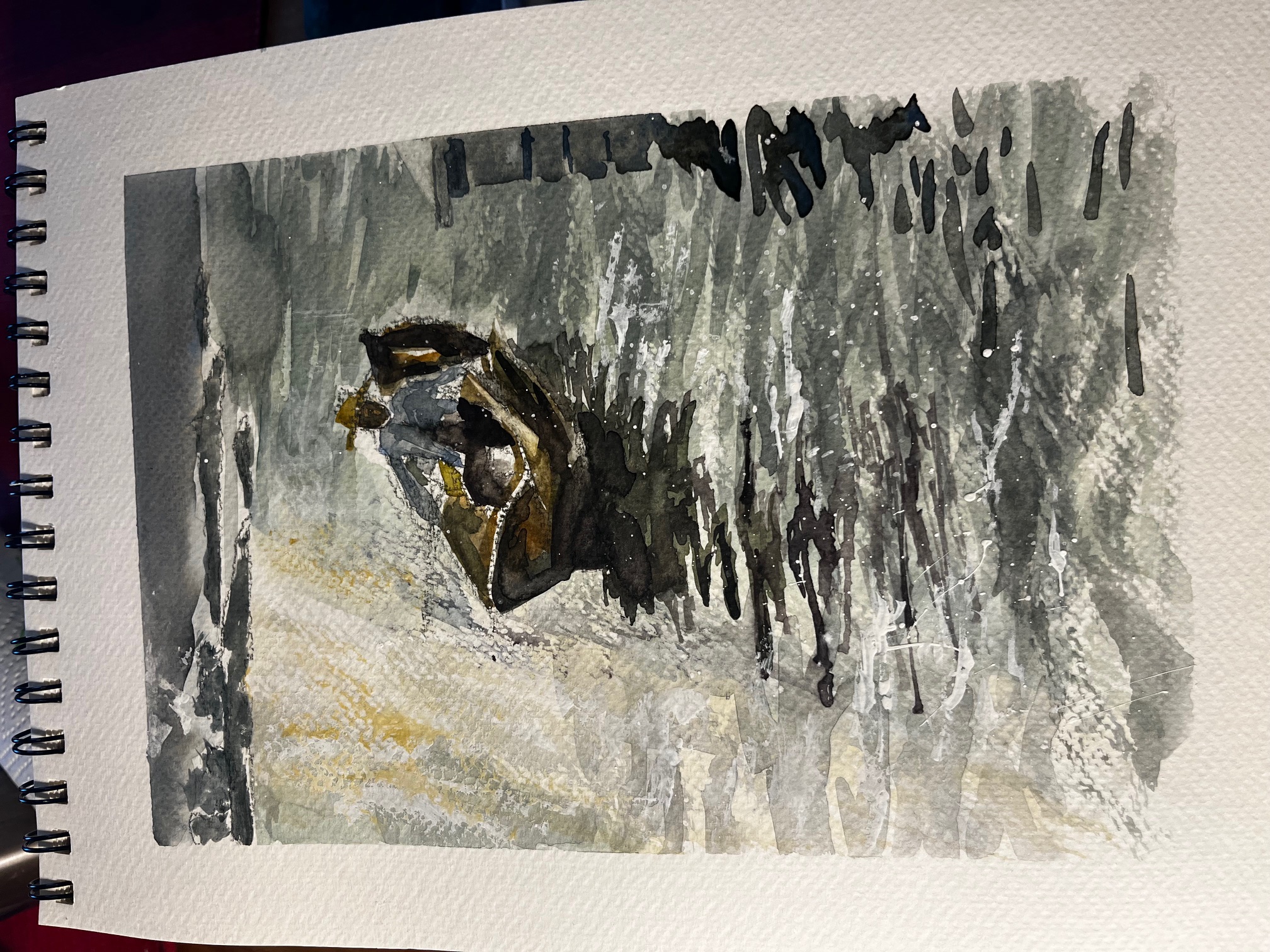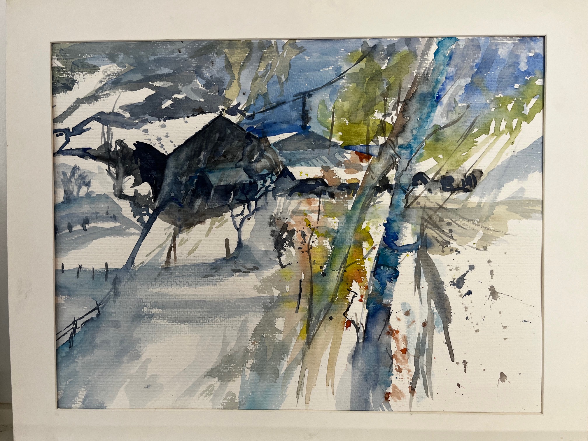 Bauernhof im Winter. Inspiriert von Bernhard Vogel. Aquarellpapier, 40 x 50 cm.