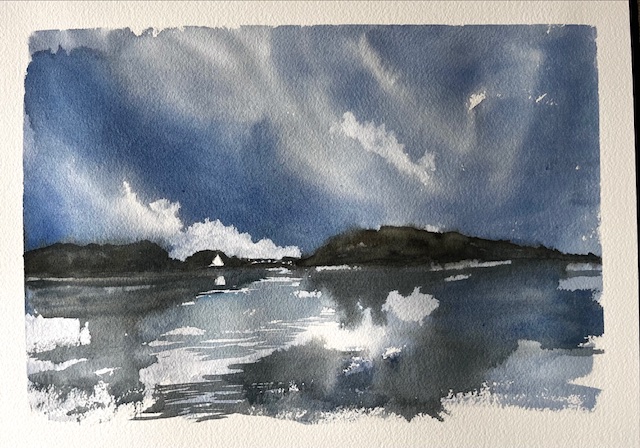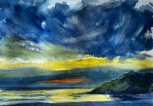Eine kleine Impression aus der Bretagne. In der Nähe von Dournanez, Finistere. Ein Sonnenuntergang nach dem Sturm! Der Umriss der kleinen Insel Ilsalgren mit ihren stattlichen ca. 1000 qm wurde mit einem hellen Rand versehen und hebt die Insel so, von dem ebenfalls gunklen Himmel ab. Die Farben sind ein bisschen krass, es sollte aber etwas an Nolde erinnern. Wichtig ist auch, dass die Insel nicht einfach ein dunkler Klotz ist, sondern auch im Dunklen noch Schattierungen zu sehen sind. Aquarell, 300 Gramm, Arches.30 x 40 cm.