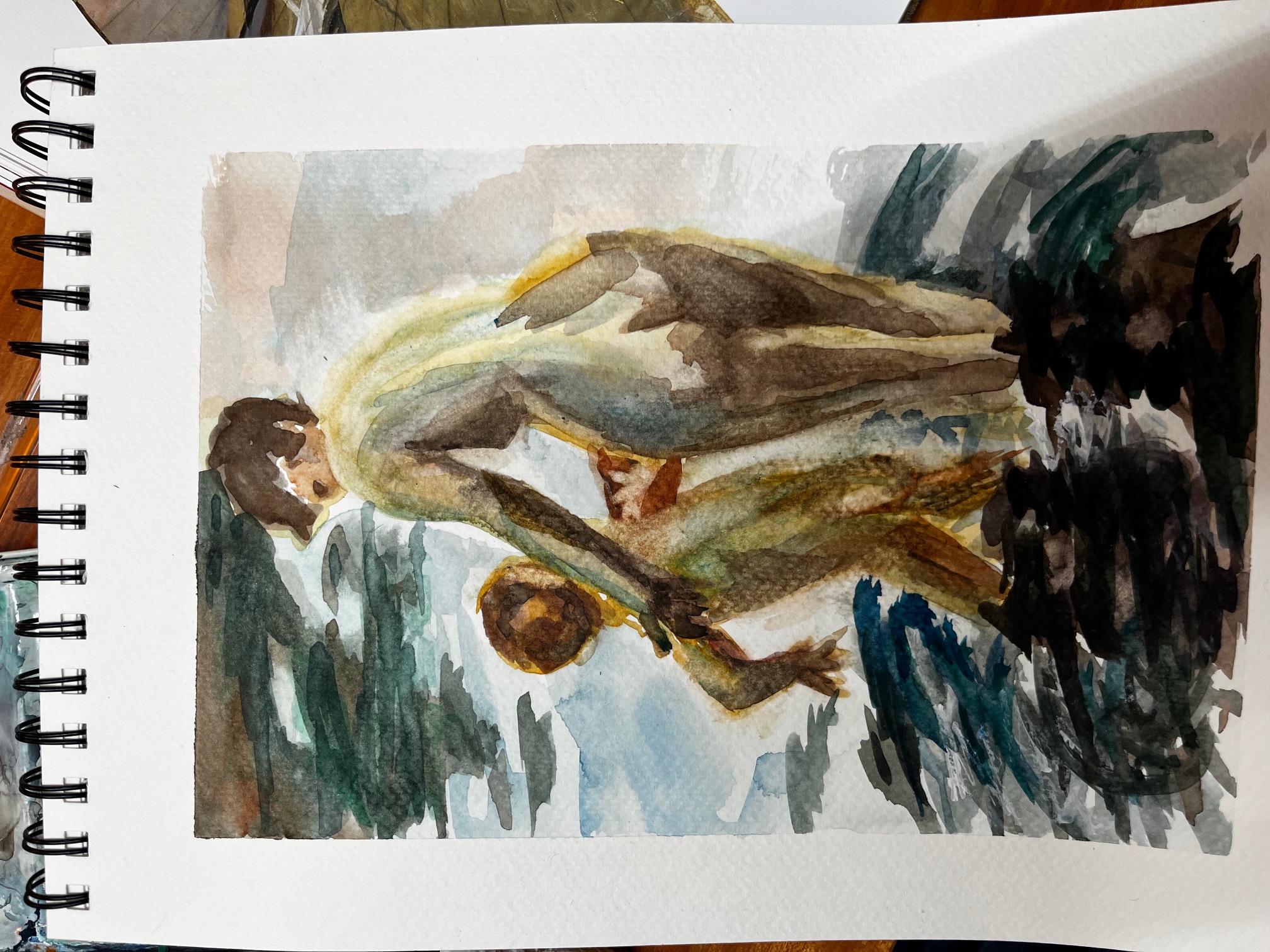 Aus dem Skizzenbuch. Eine Skizze zu Reflektionen auf dem Wasser. Original ist von Anders Zorn, einem Schwedischen Maler Anfang des letzten Jahrhunderts. Das Aquarell von mir ist im Original etwas heller.