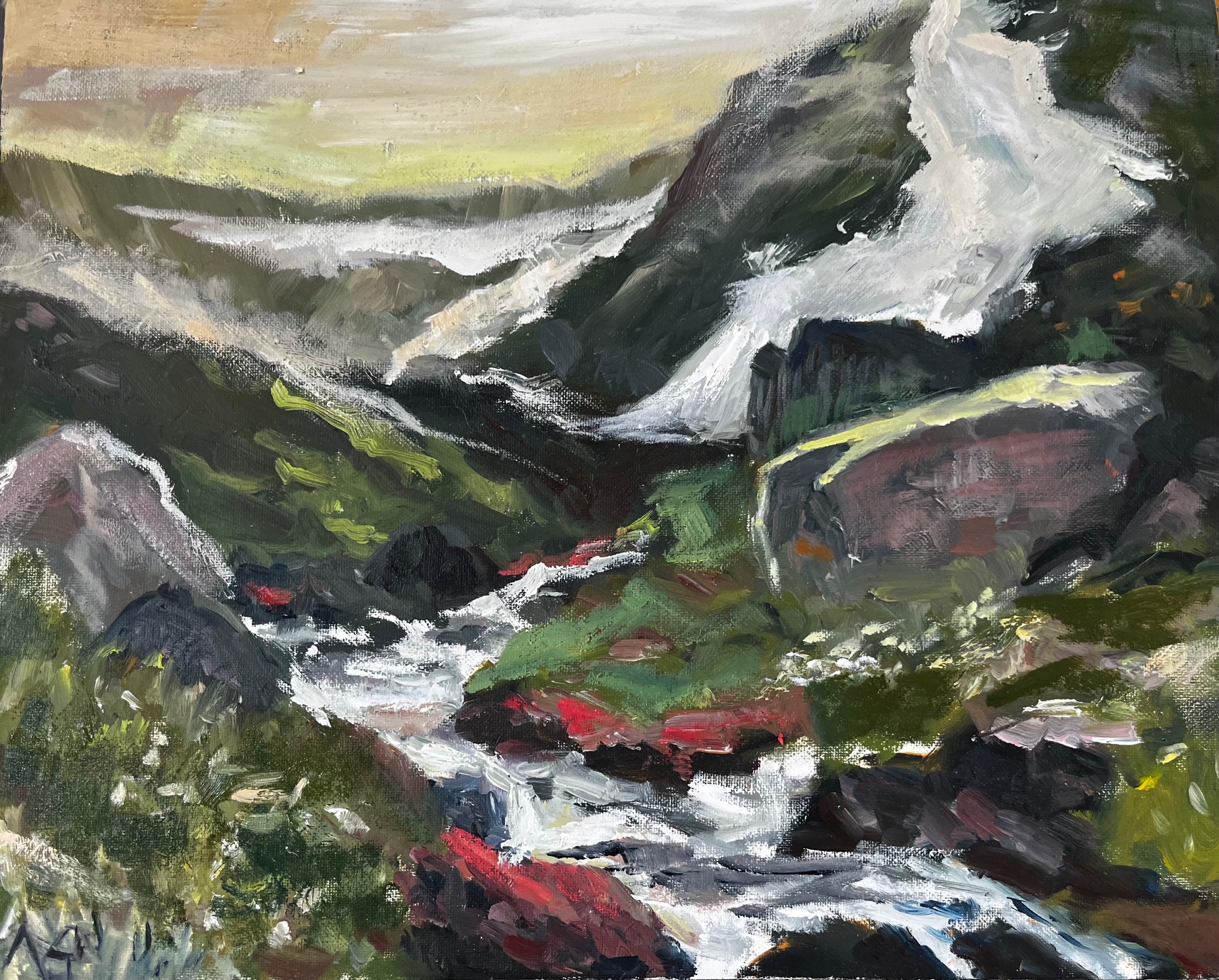 Ein Bergbach in der Morgenstimmung. Öl, Malpappe, 24 x 30 cm.