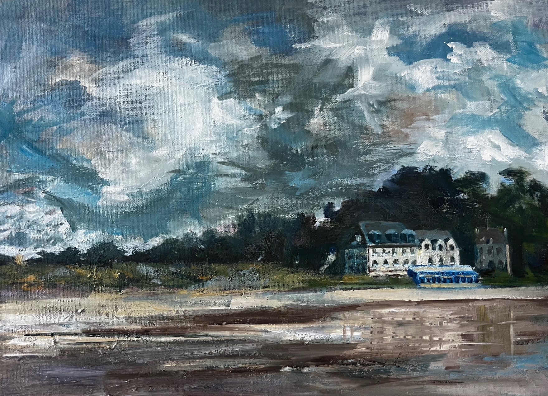Eine kleine Impression aus der Bretagne. In der Nähe von Dournanez, Finistere. Das Hotel "La Plage". Sehr schöne Lage. Sehr oft das Ziel des Hundespaziergangs. Schöne Terrasse! Öl, 30 x 40 cm, Malplatte.