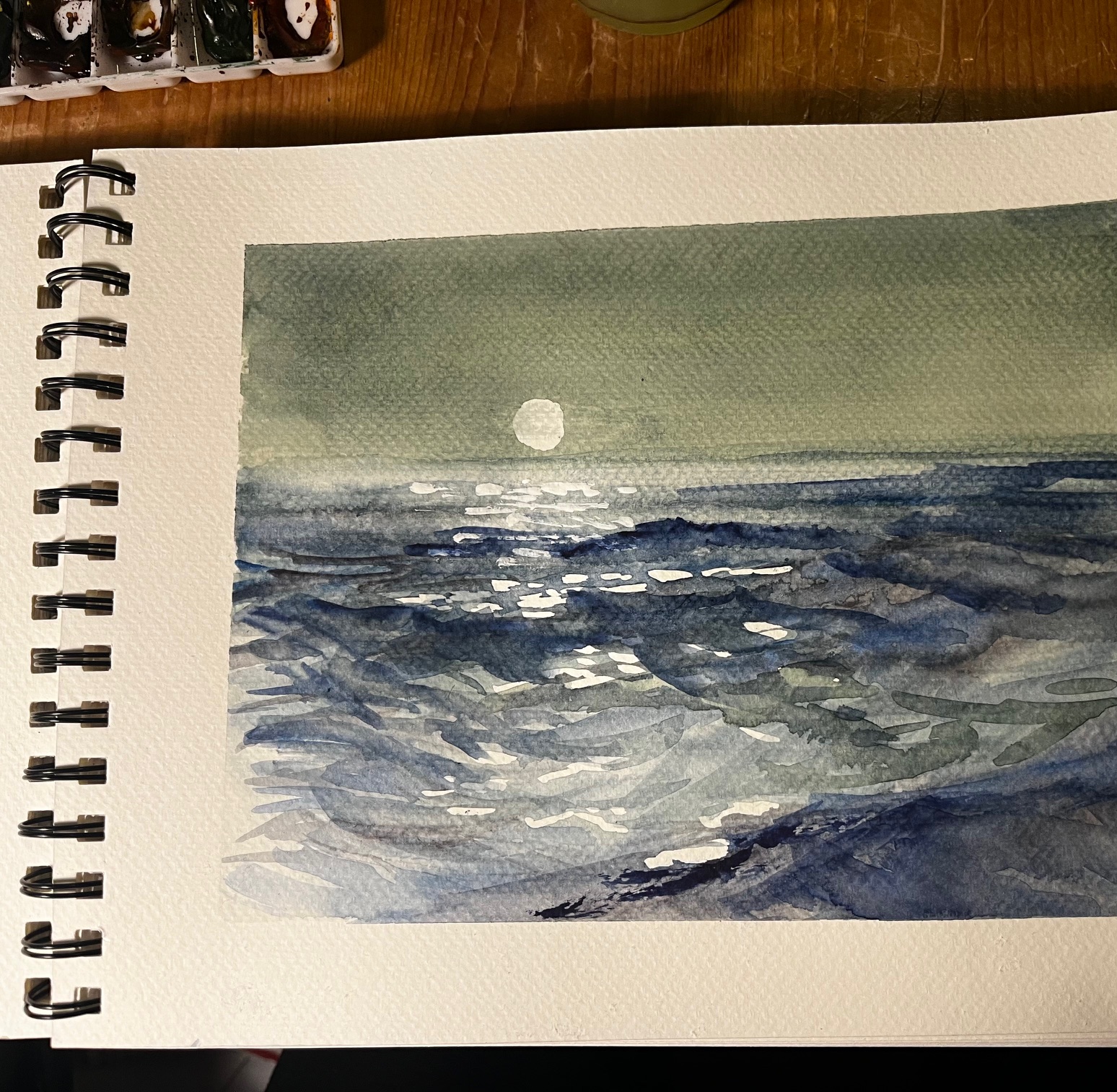 Aus dem Skizzenbuch. Eine helle Mondnacht über Wasser. Aquarell.