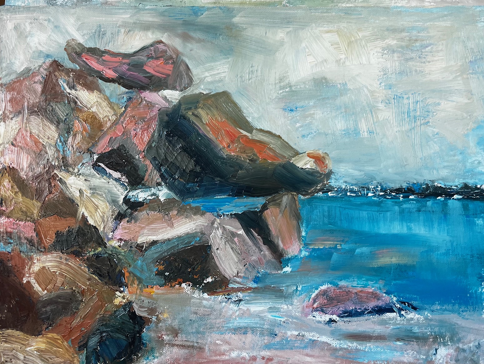 Eine kleine Impression aus der Bretagne. Auf der Ile-Grande.Das Wasser ist sehr zurückgegangen. Mit Pinsel und Spachtel gearbeitet. Öl, 30 x 40 cm, Malplatte.