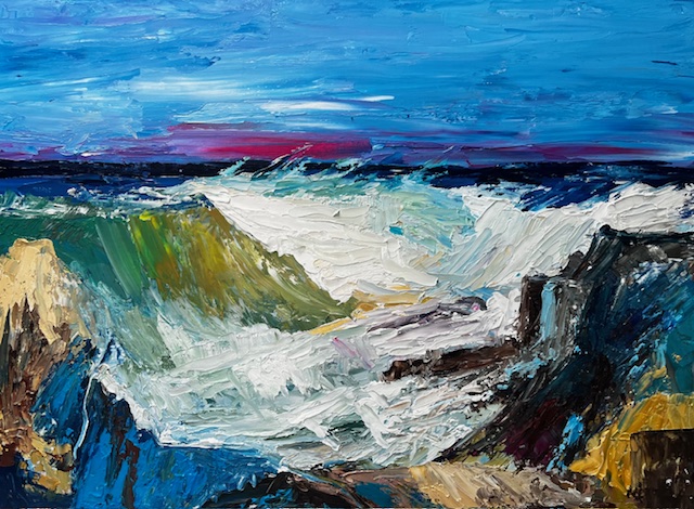 Eine kleine Impression aus der Bretagne. Auf der Ile-Grande.Ein Sonnenuntergang nach dem Sturm. Sehr großzügig mit der Spachtel gearbeitet. Das ergibt interessante Farbverläufe, besonders in den Wellen. Die Felsen bekommen, fast automatisch, schöne Texturen. Öl, 30 x 40 cm, Malplatte.