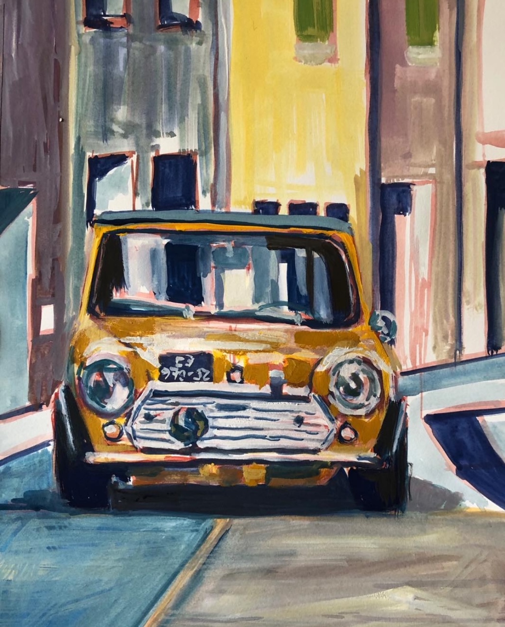 „Man kann auch mal das Auto stehen lassen“ , Gouache, 30 x 40 cm. Aquarellpapier, heiß gepresst“.