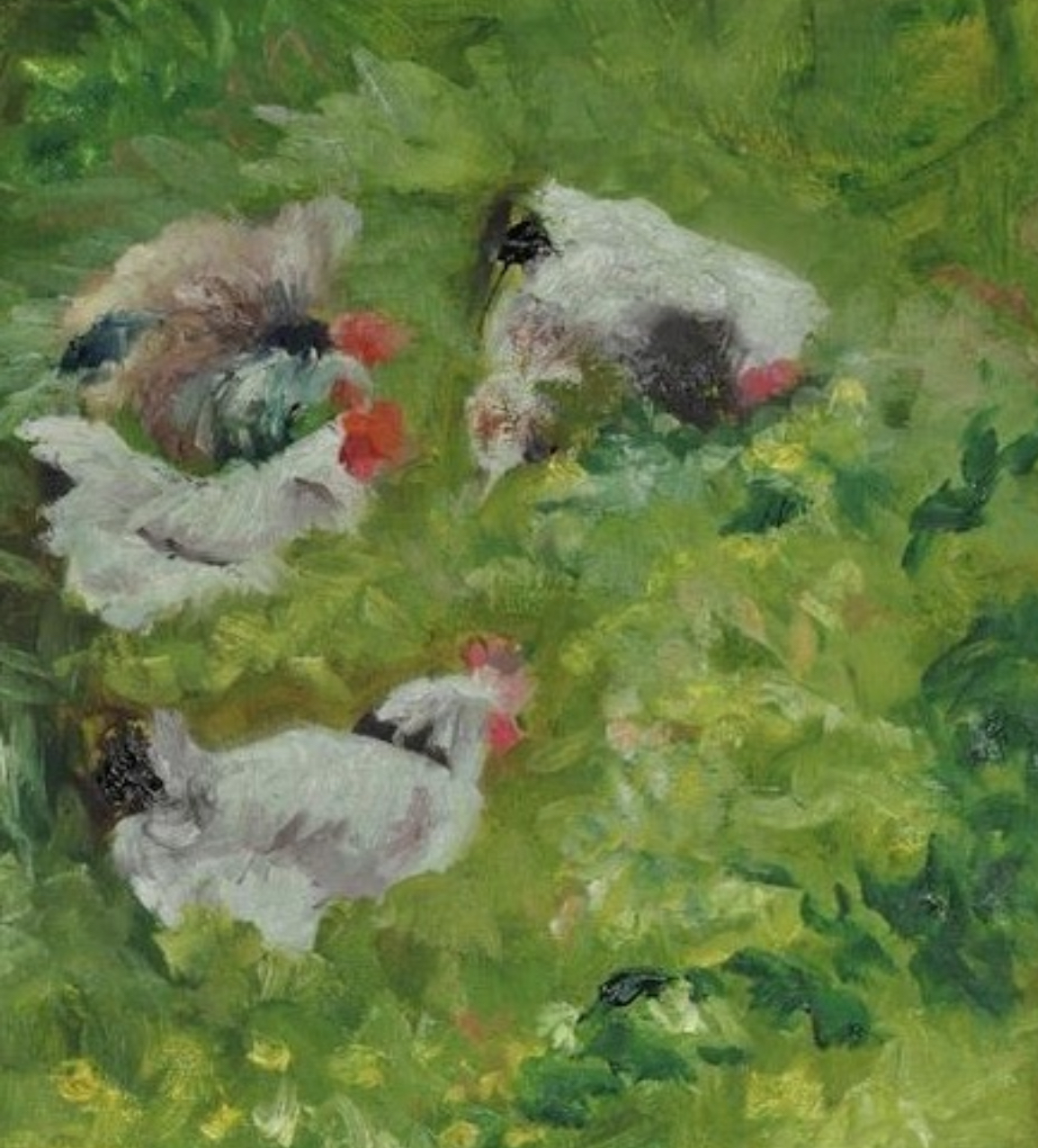 „This oilpainting shows you some hens out of the cage. Using a palette knife creates more structure reminding you of impressionistic paintings“.
