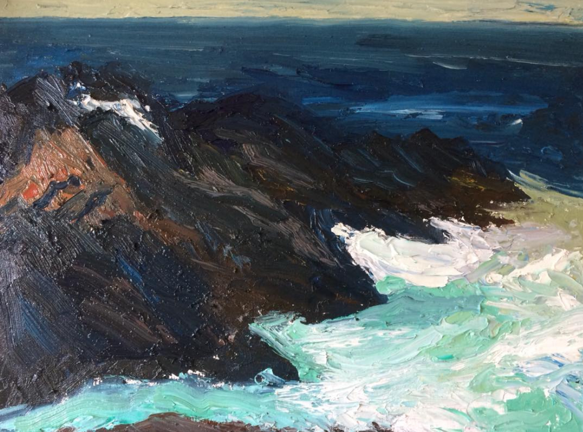 Eine kleine Impression aus der Bretagne. Auf der Ile-Grande.Ein Sonnenuntergang nach dem Sturm. Sehr großzügig mit der Spachtel gearbeitet. Das ergibt interessante Farbverläufe, besonders in den Wellen. Die Felsen bekommen, fast automatisch, schöne Texturen. Öl, 30 x 40 cm, Malplatte.