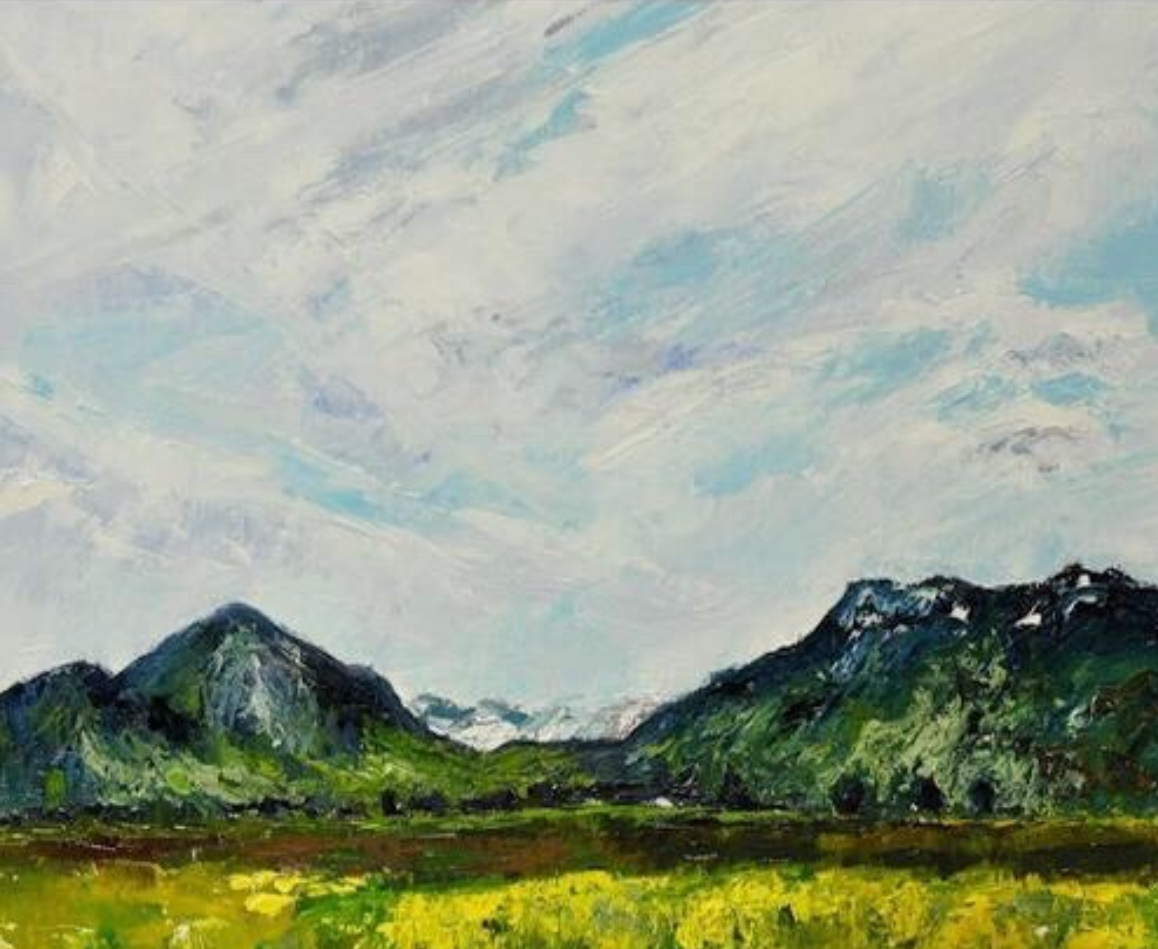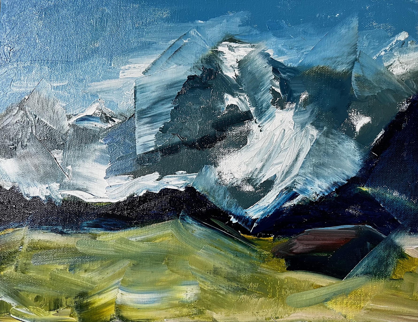 Am 21.4.24 wurde an der VHS FFB ein Ölmalkurs von mir durchgeführt. Hier wurde ordentlich genützelt und gewolbert. Buckelwiesen am Karwendel bei Mittenwald. ÖL, 24 x 30 cm