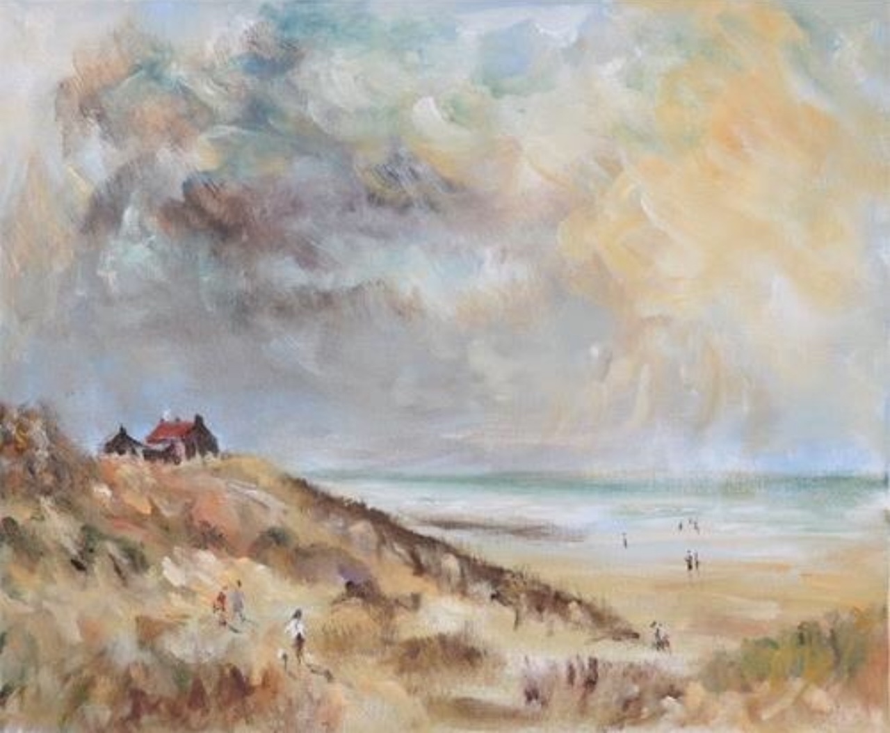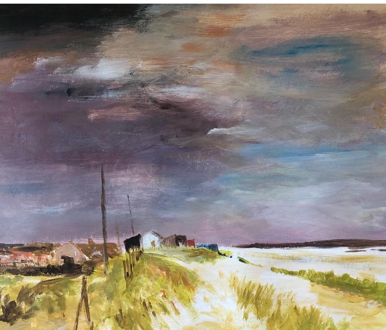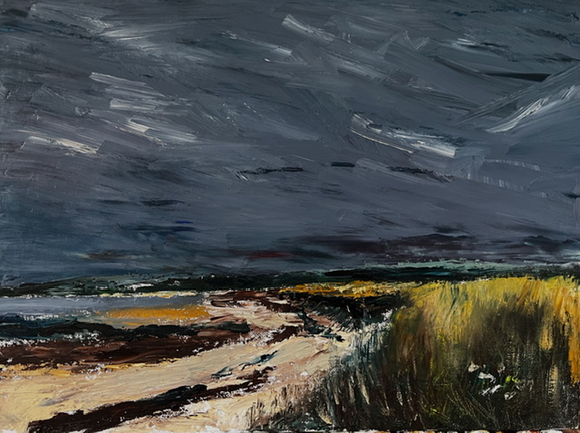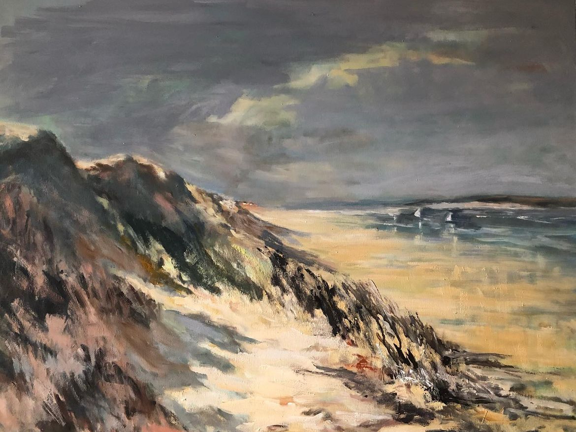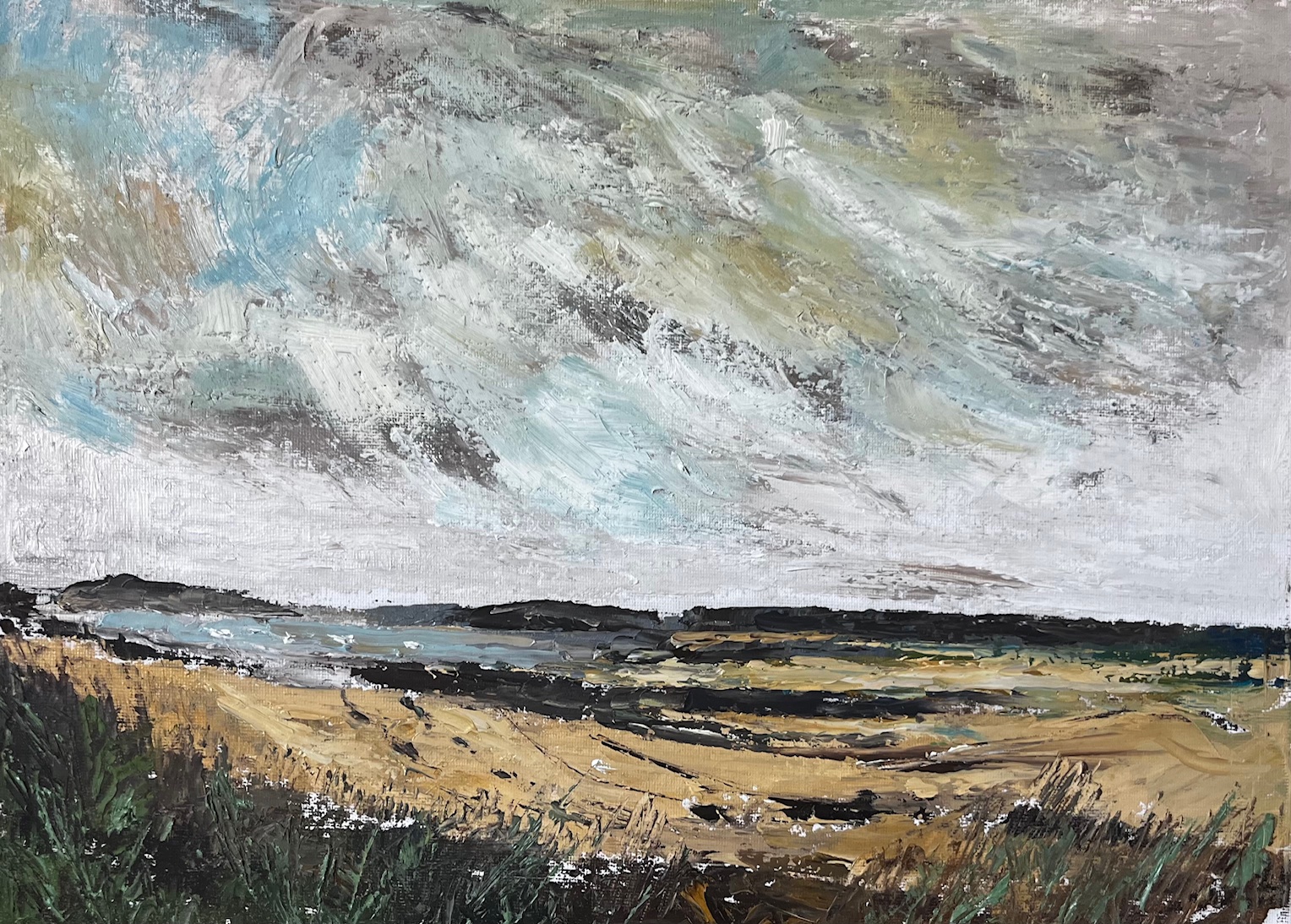 Eine kleine Impression aus der Bretagne. Auf der Ile-Grande. Nach dem Sturm. Sehr großzügig mit der Spachtel und dem Pinsel gearbeitet. Damit kann man Gräser der Dünen einfach andeuten. Öl, 30 x 40 cm, Malplatte.