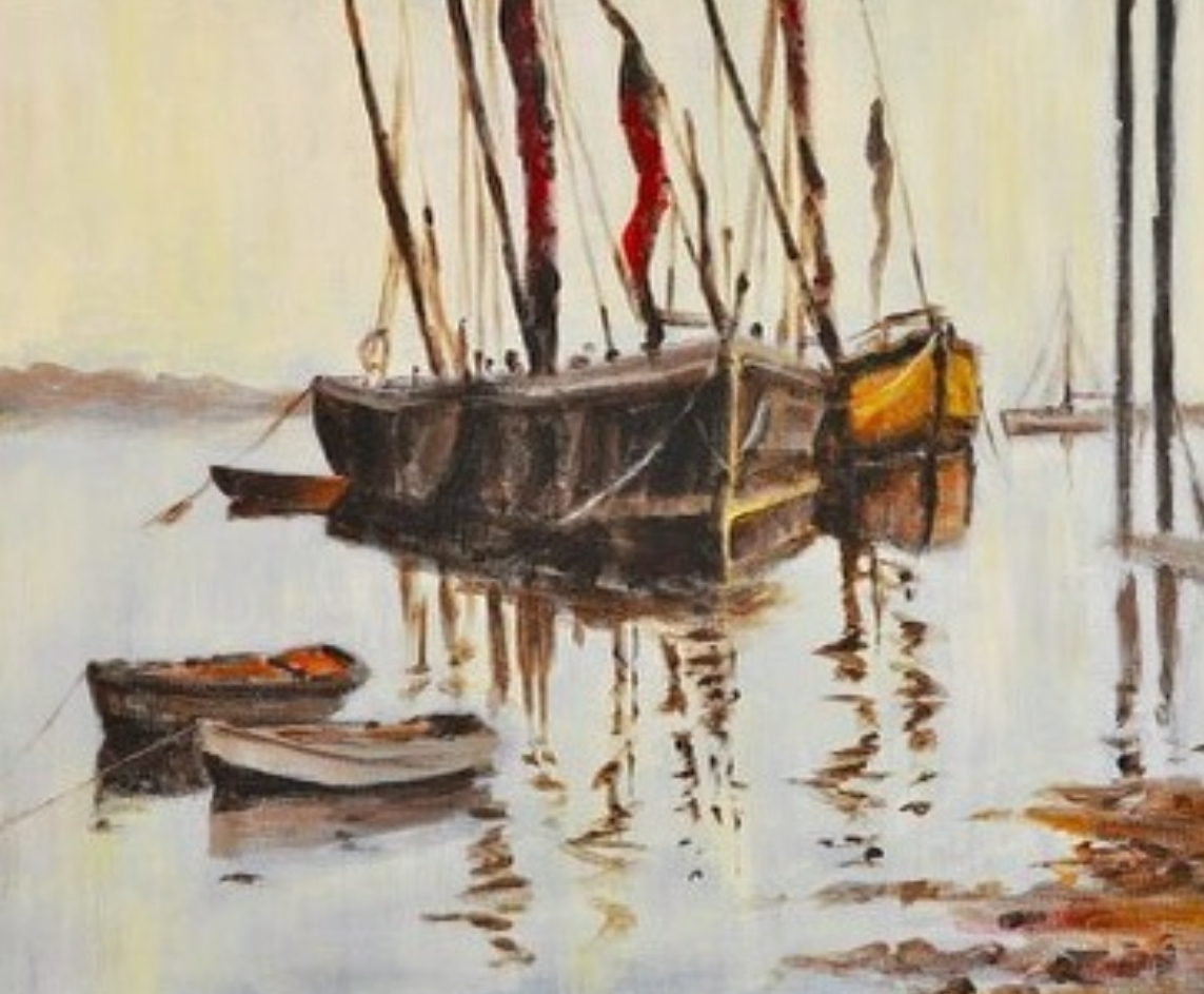 „This oilpainting was inspired by Seago, a British painter of the last century. You can see some old ships on the River Thames“.