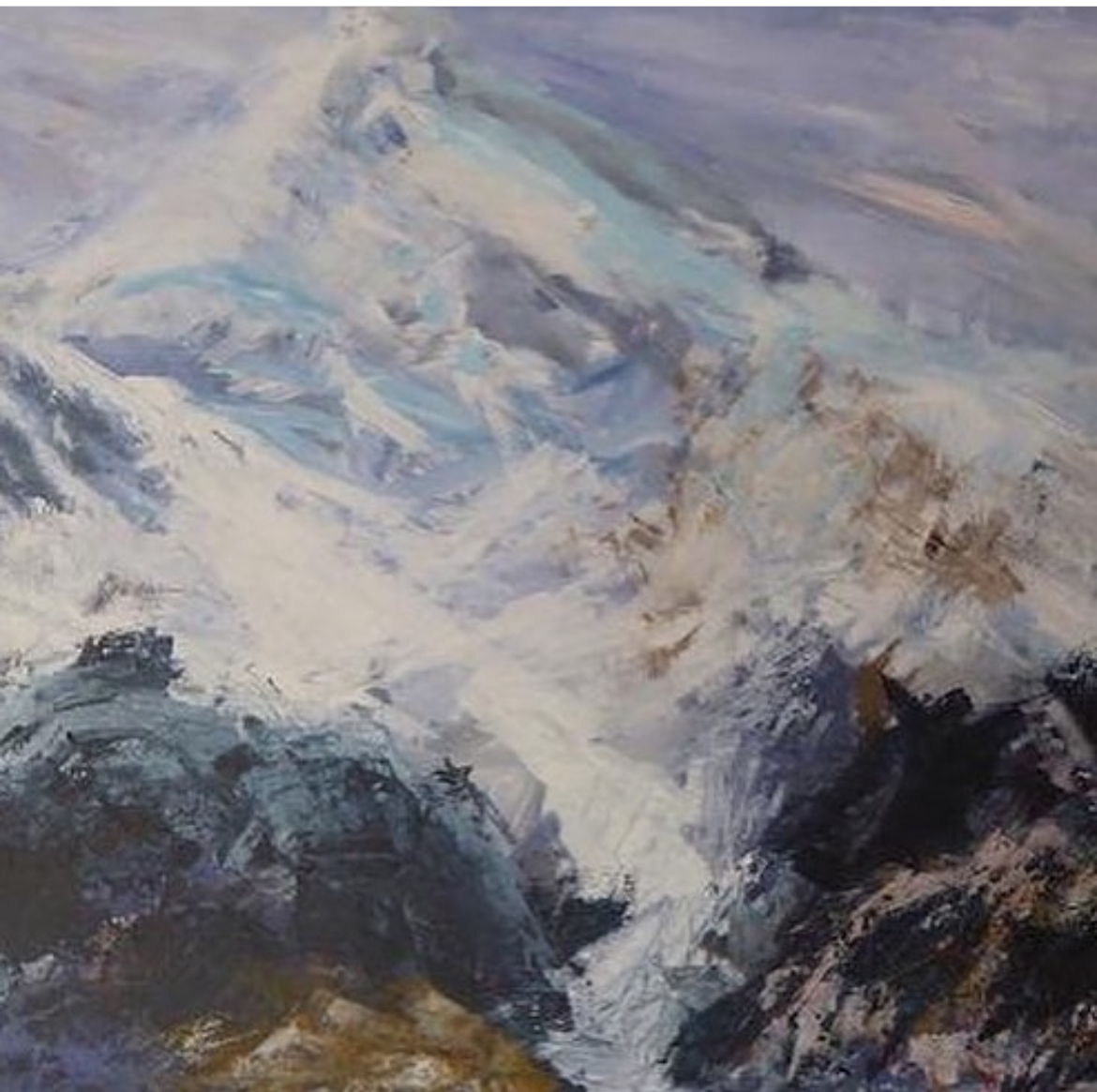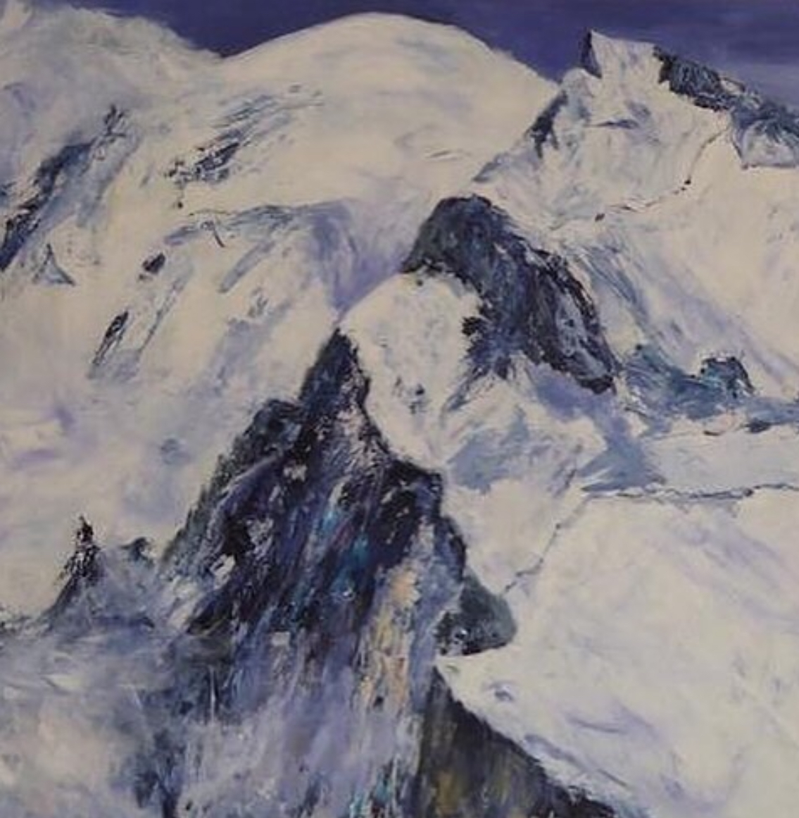 „This oilpainting gives you a view to Mont Blanc standing on mountain Tacul. Mount Blanc is the highest mountain in Europe“.