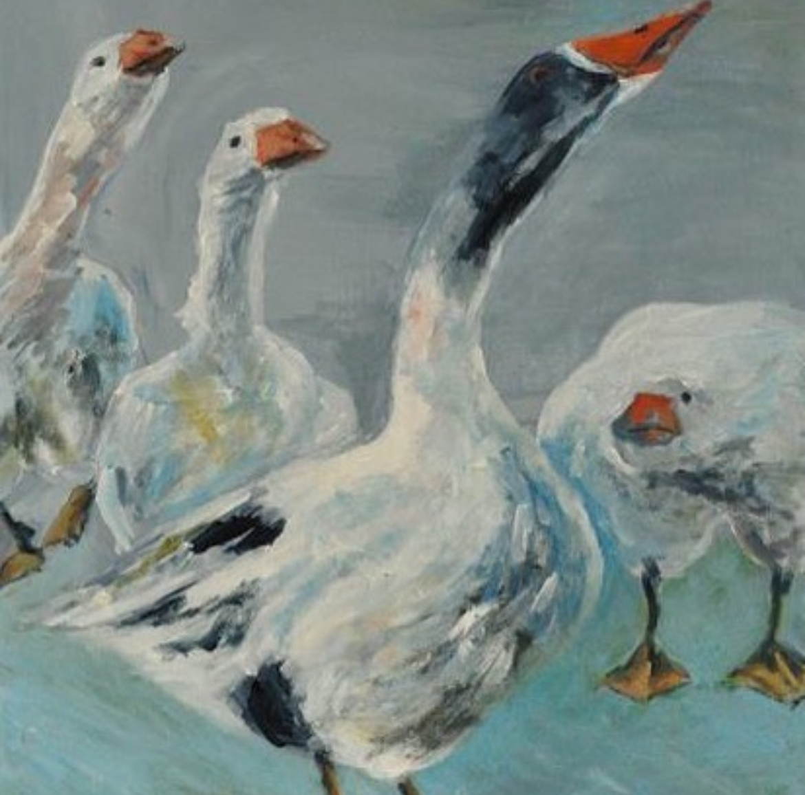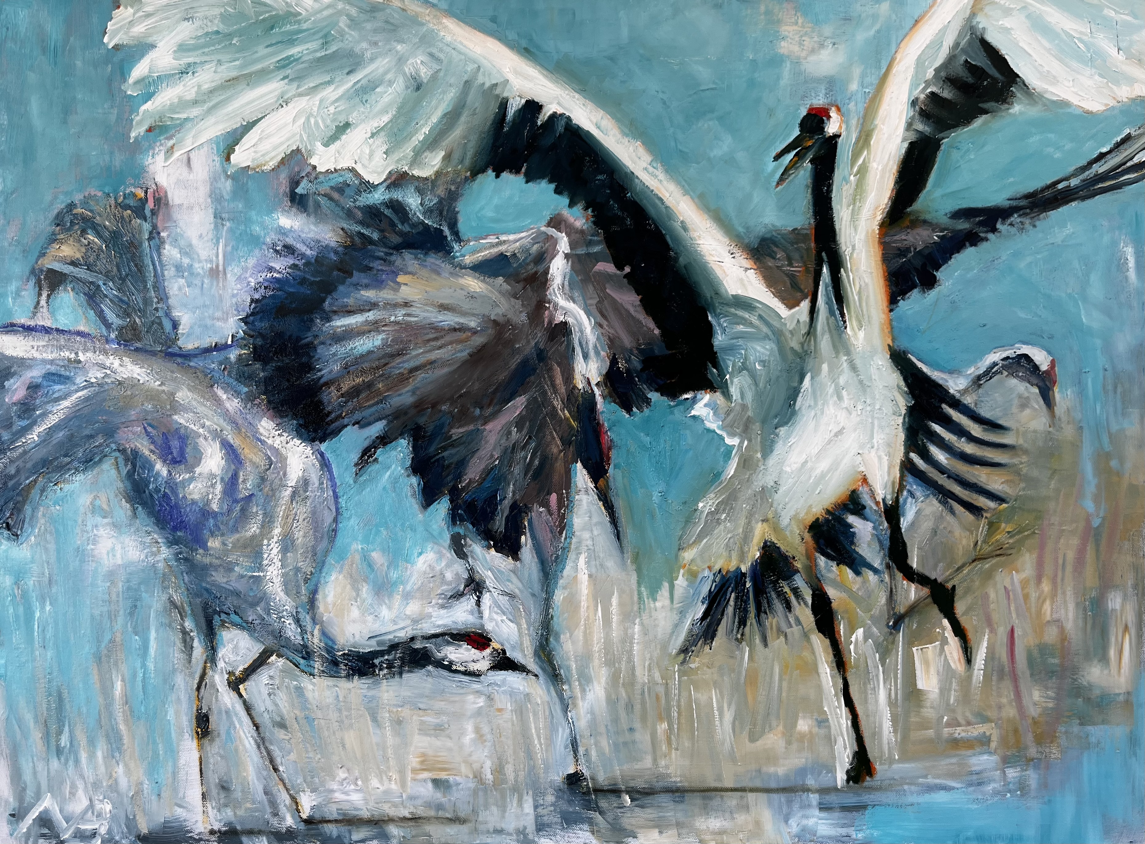 Hier tanzt der Kranich. Ich war im Herbst in Frankreich am Lac de Der. Jeden Tag kamen ca. 20.000 Kraniche auf ihrem Weg nach Süden. Es war ein ziemliches Spektakel. Vielleicht wird das Bild noch etwas überarbeitet, das heißt etwas dynamischer gemacht, indem mit der Spachtel Hintergrundfarbe in die Kraniche gezogen wird. Mal sehen.