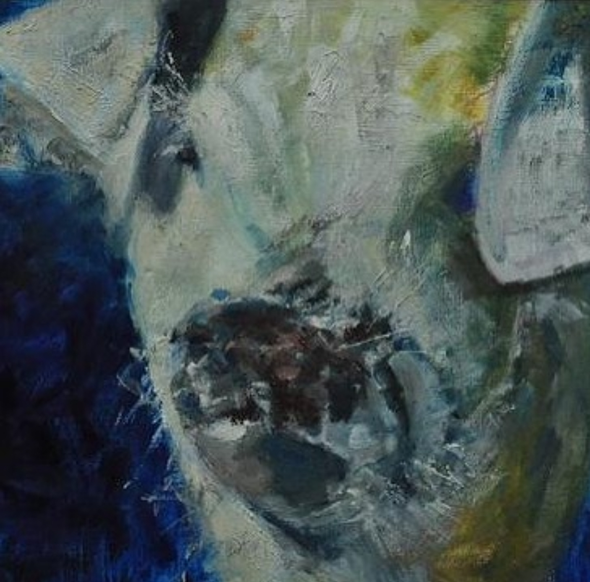 Aus der Serie „Tiere lügen nicht!“ „Siesta“, neue Version. Es handelt sich um ein Schwäbisch-Hällisches Landschwein. Softpastell, 30x30 cm. Dieses Schwein lebte auf dem Stanishof. Für mich der beste Metzger in Germering! Wohne um die Ecke.