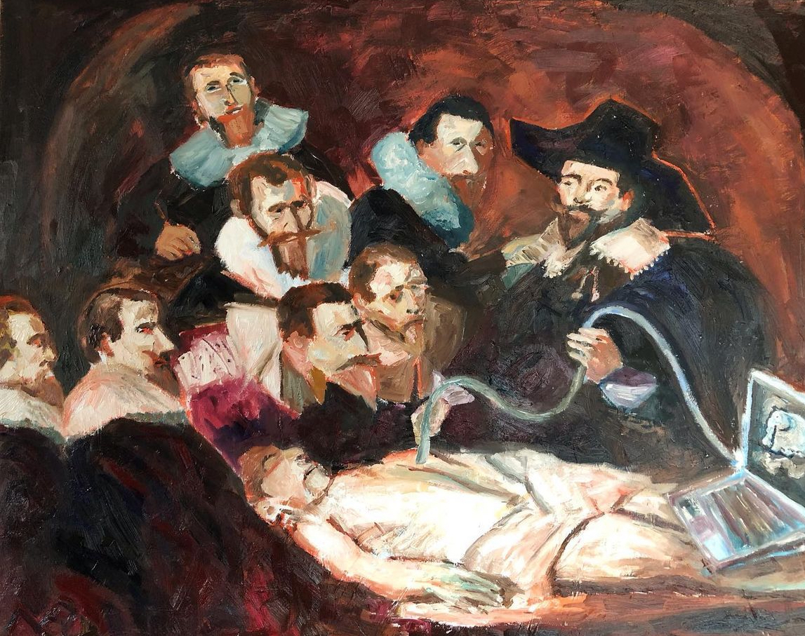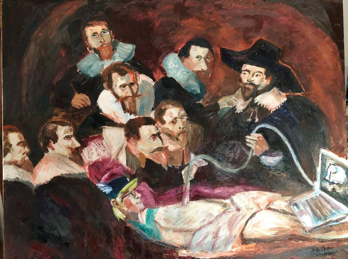 „Dr. Tulp von Rembrandt etwas modernisiert. Diesmal mit Ultraschall und etwas großzügigerer Pinselführung. Dr. Tulp entdeckt unglaubliche „Sache“ bei Otto. Öl, 100 x 120 cm, Keilrahmen."