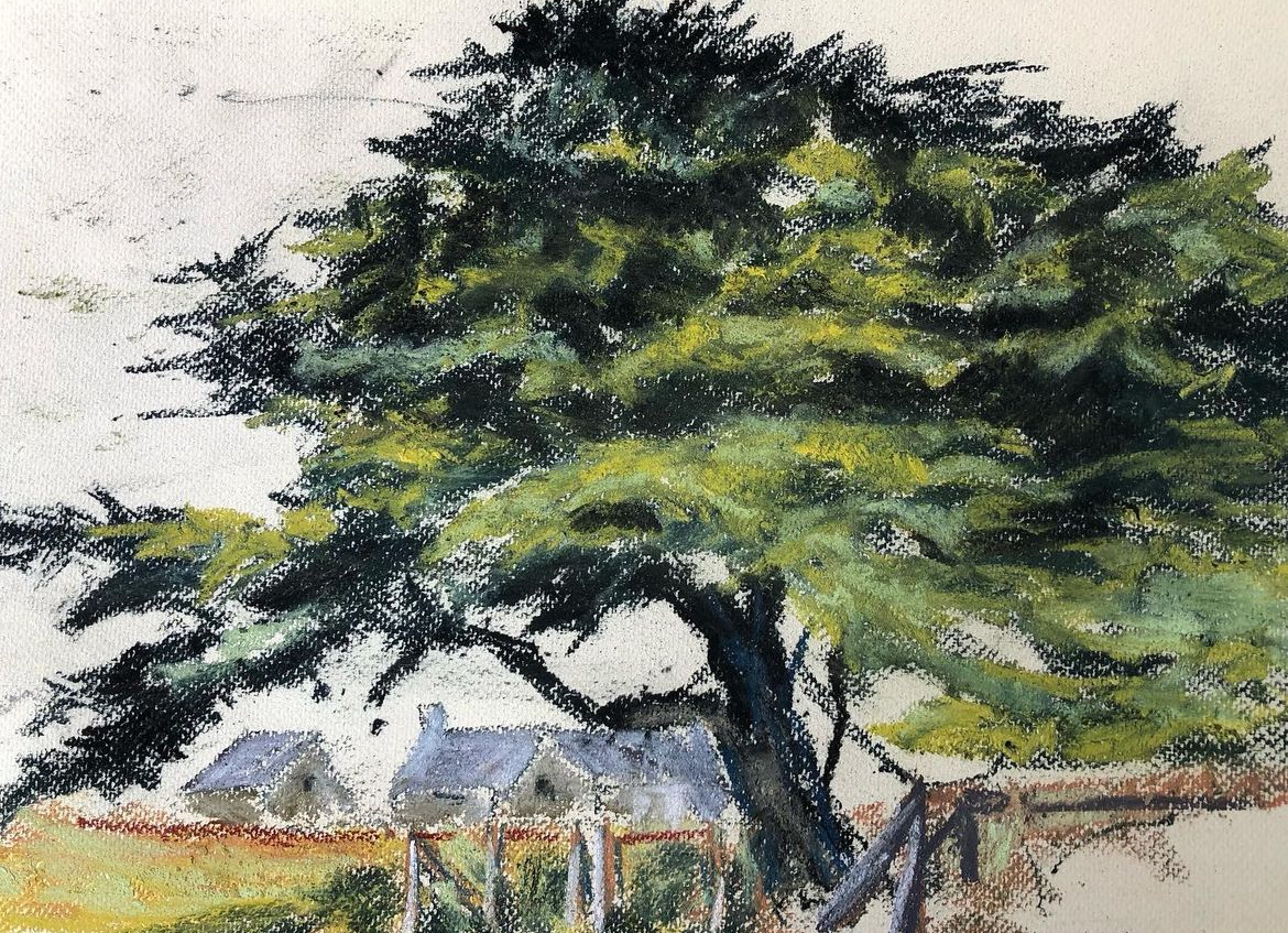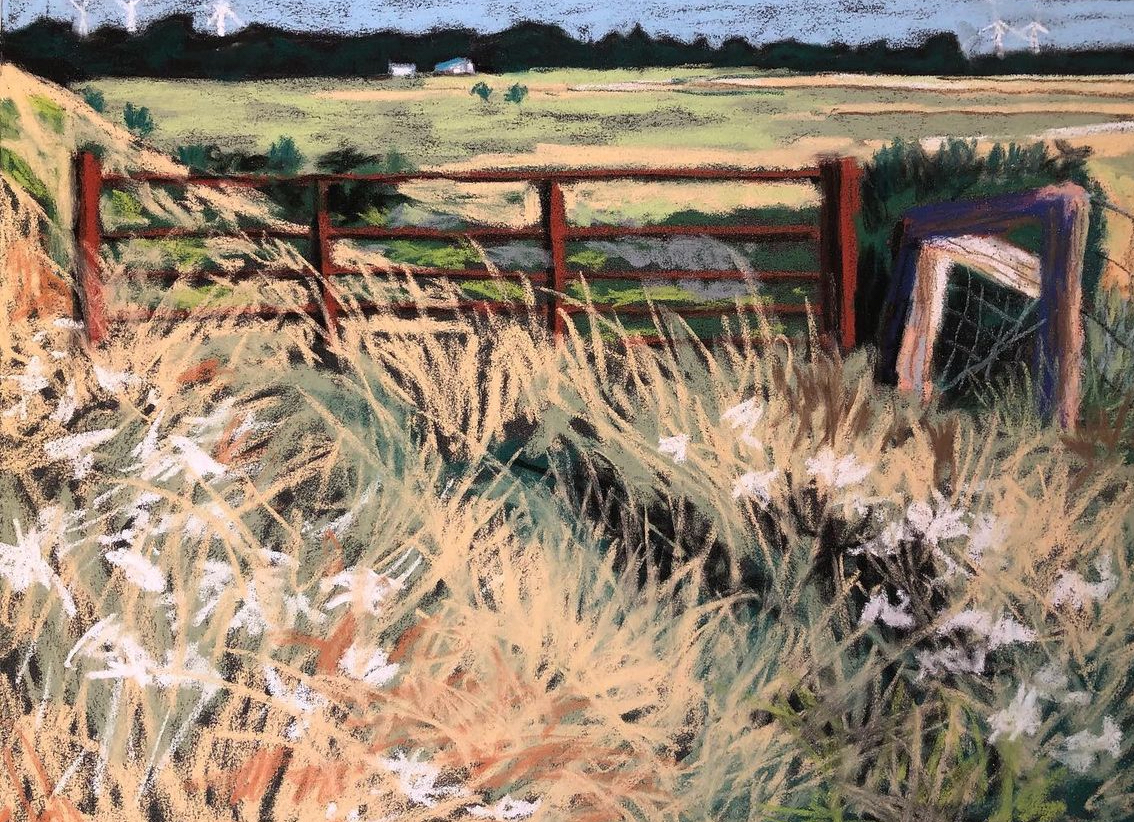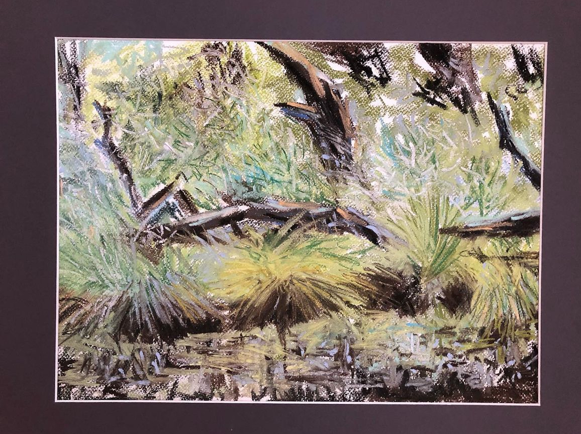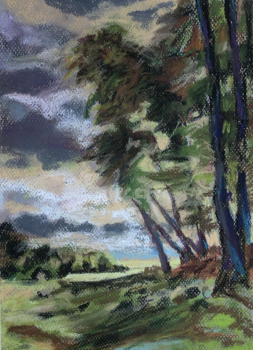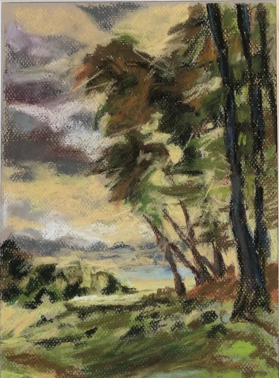 „Diese kleine Küstenansicht wurde in Baabe an der Ostsee mit Softpastell gemalt. Mit Passpartout. Es ist eine Gegenlicht-Studie.