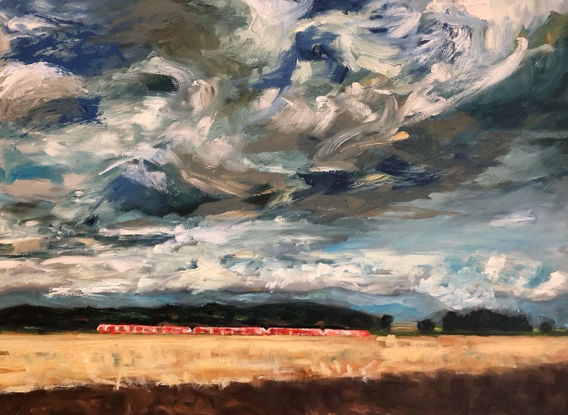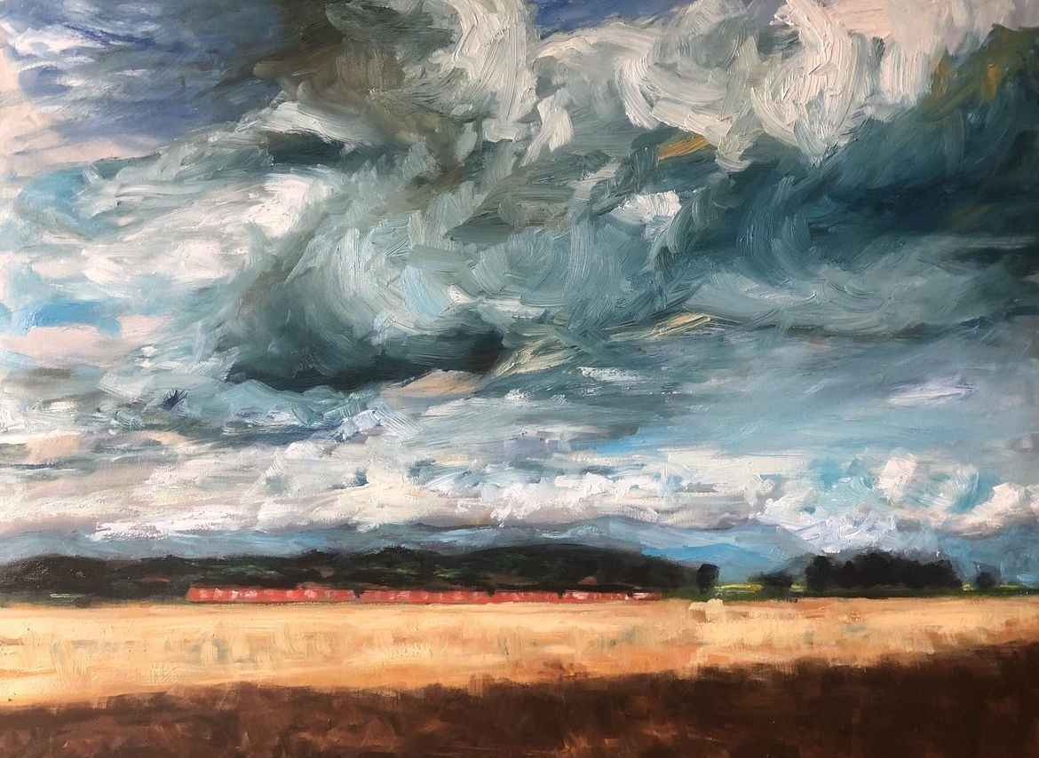 Nach dem Gewitter. In der Nähe von Nebel. Das Kornfeld wurde etwas in Mitleidenschaft gezogen. Noch etwas mit dem Shaper nachbearbeitet. Öl, Malplatte, 26 x 30 cm.Das Original ist etwas heller.