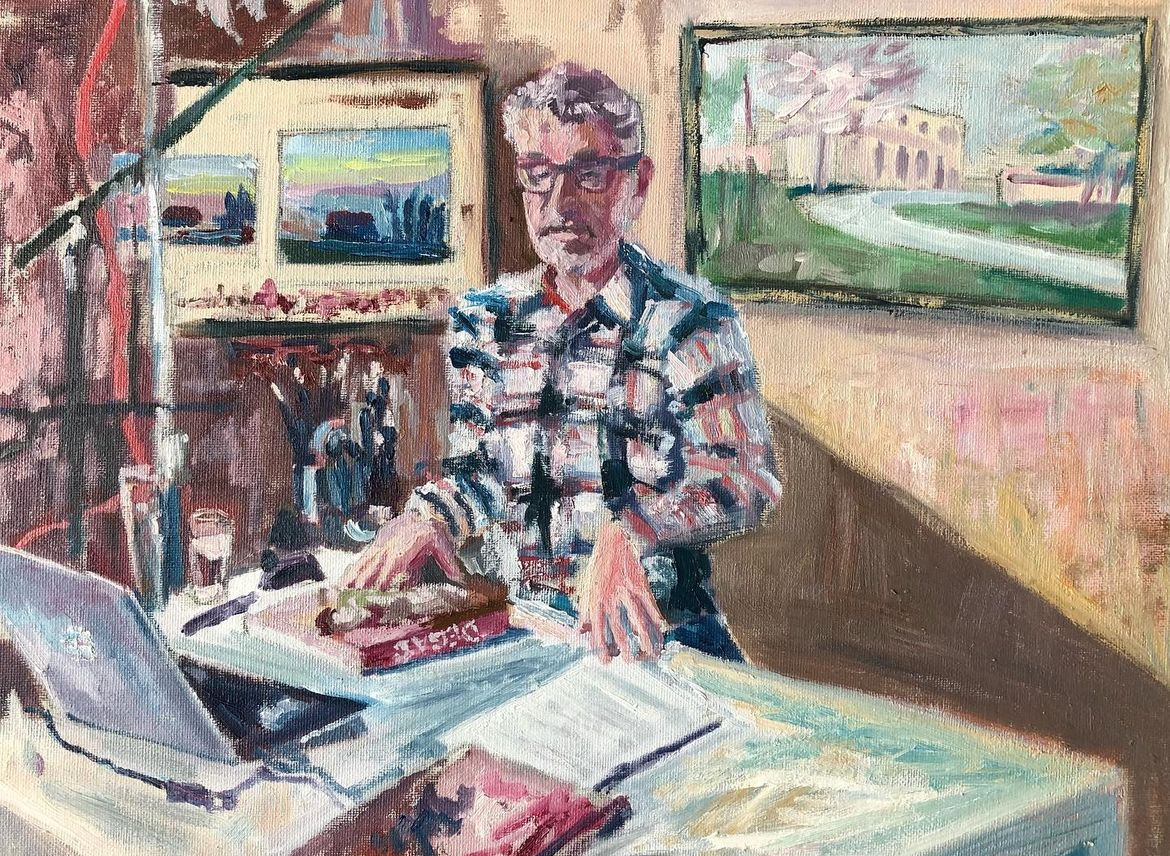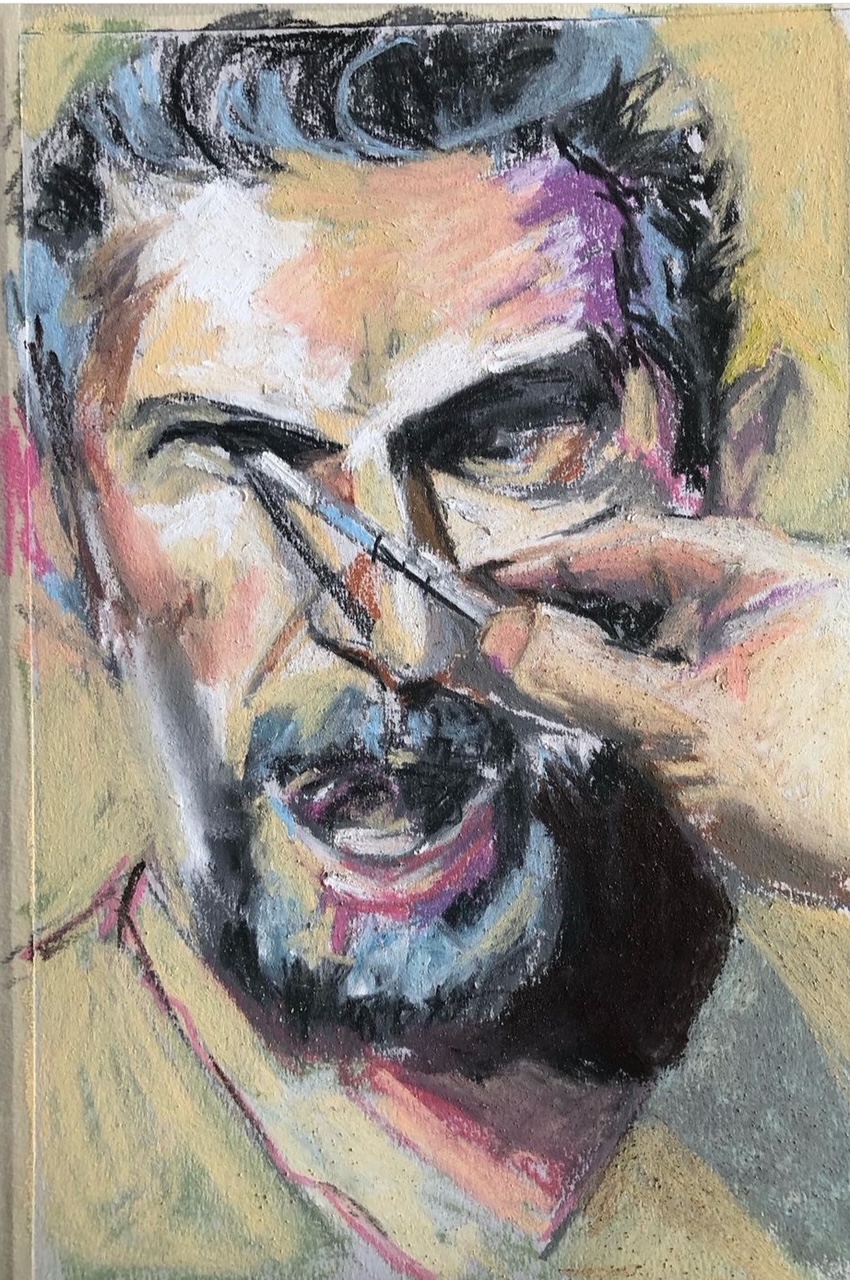 „Der Maler und Kunstpädagoge @stefan_nuetzel bei einem verhängnisvollen Fehler. Er kommt, beim Selbstporträt, mit dem Pinsel zu nahe an sein Auge. Das tat richtig weh!