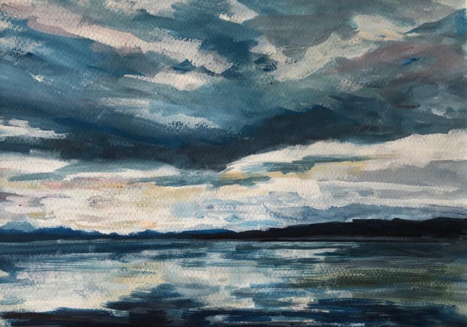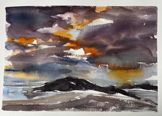 Eine kleine Impression aus der Bretagne. In der Nähe von Dournanez, Finistere. Ein Sonnenuntergang nach dem Sturm! Der Umriss der kleinen Insel Ilsalgren mit ihren stattlichen ca. 1000 qm wurde mit einem hellen Rand versehen und hebt die Insel so, von dem ebenfalls gunklen Himmel ab. Die Farben sind ein bisschen krass, es sollte aber etwas an Nolde erinnern. Wichtig ist auch, dass die Insel nicht einfach ein dunkler Klotz ist, sondern auch im Dunklen noch Schattierungen zu sehen sind. Aquarell, 300 Gramm, Arches.30 x 40 cm.