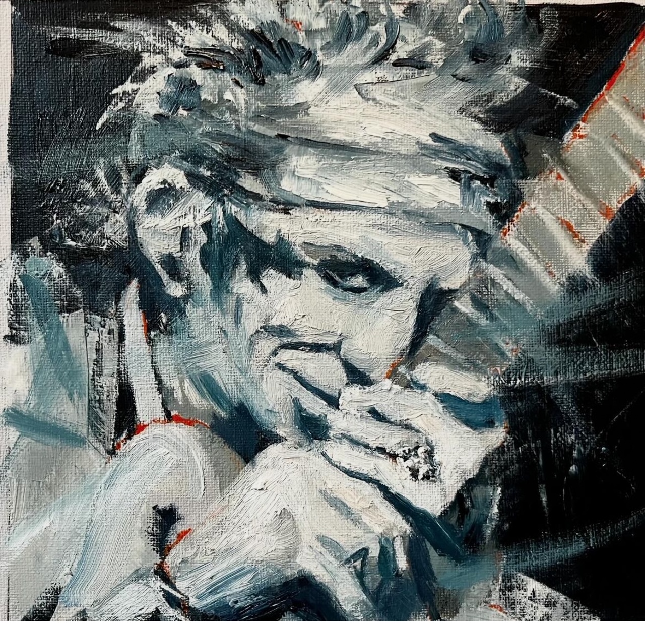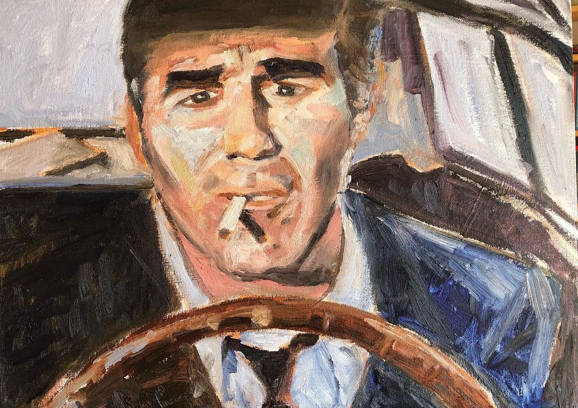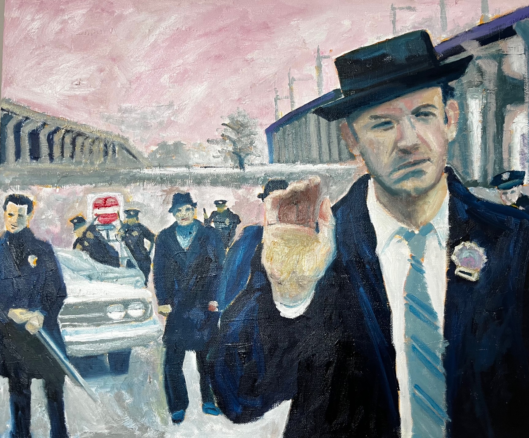 War nicht so einfach die Coolness und auch den kleinen Zweifel rüberzubringen. Der „Bart“ sitzt vermeintlich in der Falle. Wer nicht weiß um was es sich handelt: Gene Hackman im Film French Connection. Der „Bart“ hat sich von ihm, nach einer wilden Verfolgungsjagd mit Handwinken aus der SBahn heraus verabschiedet. Hackman begrüßt ihn nun mit Winke Winke in der Sackgasse! Roy Scheider musste ich etwas nach rechts versetzen. Er sollte schon drauf sein! Öl, 50 x 60 cm, Keilrahmen.