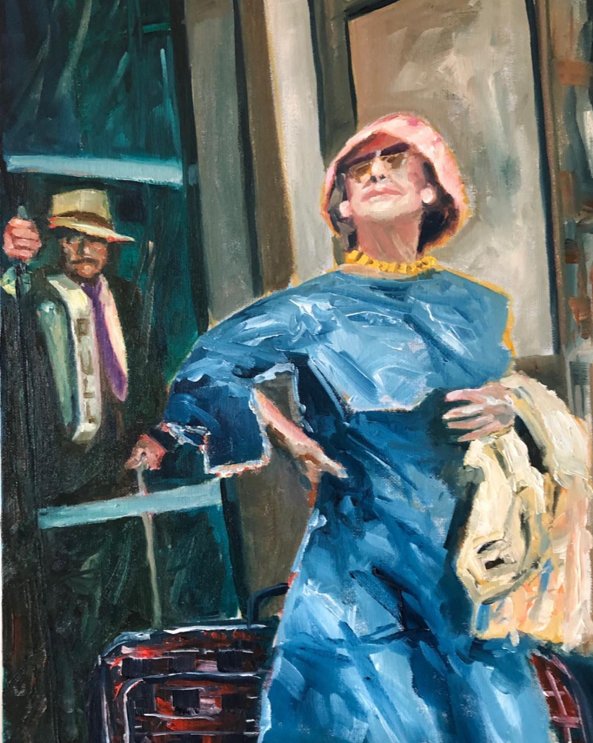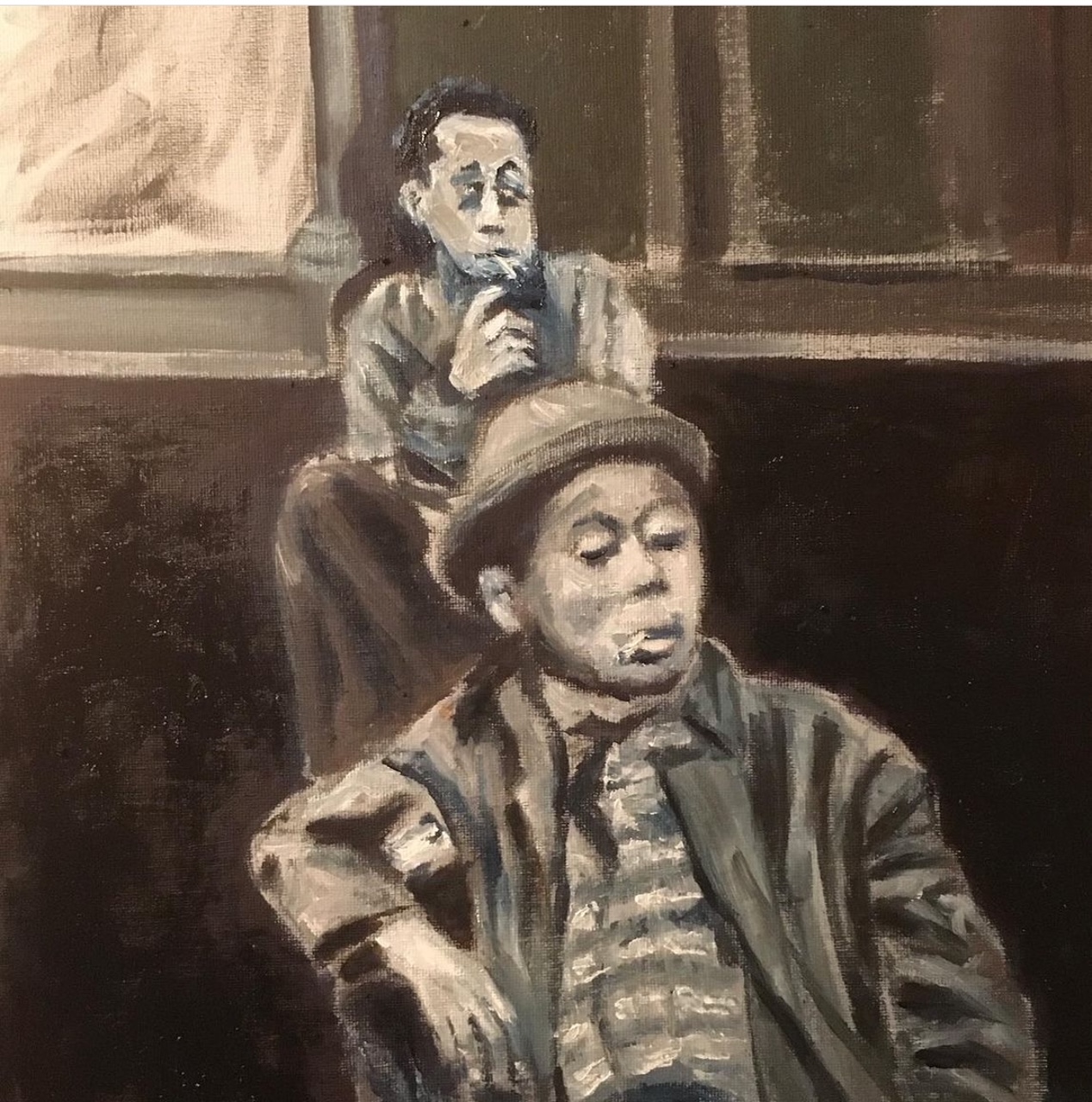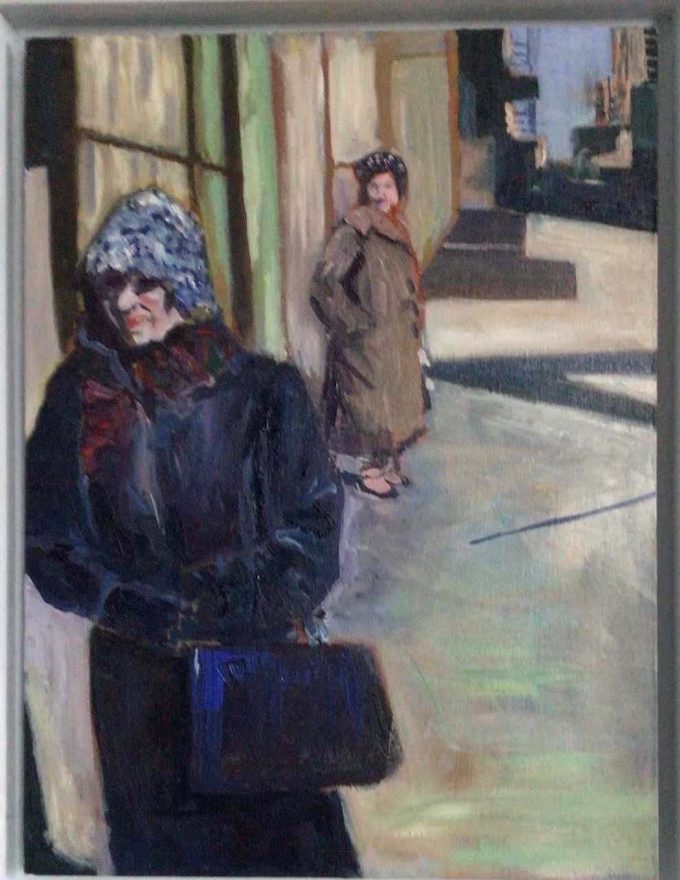 War nicht so einfach die Coolness und auch den kleinen Zweifel rüberzubringen. Der „Bart“ sitzt vermeintlich in der Falle. Wer nicht weiß um was es sich handelt: Gene Hackman im Film French Connection. Der „Bart“ hat sich von ihm, nach einer wilden Verfolgungsjagd mit Handwinken aus der SBahn heraus verabschiedet. Hackman begrüßt ihn nun mit Winke Winke in der Sackgasse! Roy Scheider musste ich etwas nach rechts versetzen. Er sollte schon drauf sein! Öl, 50 x 60 cm, Keilrahmen.