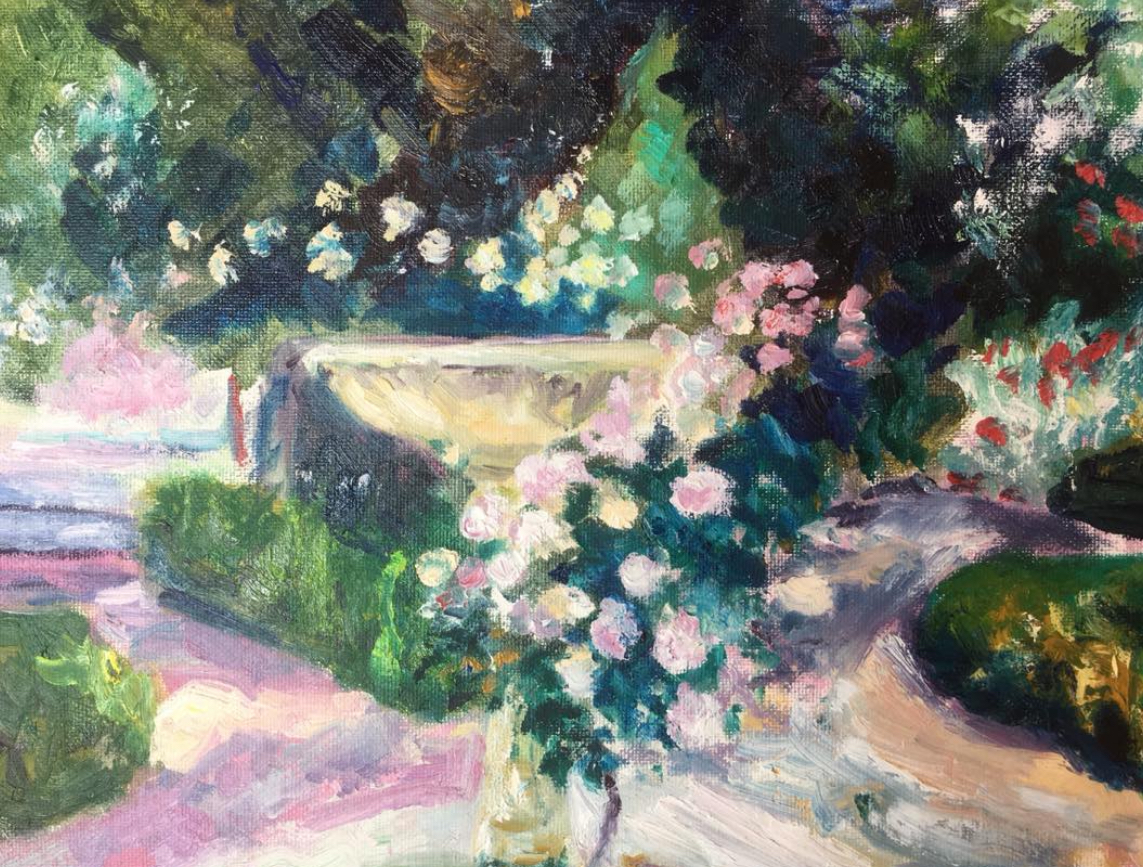 „This roses oilpainting is based on an original sketch by J. Sorolla , a Spanish painter of the last century“.