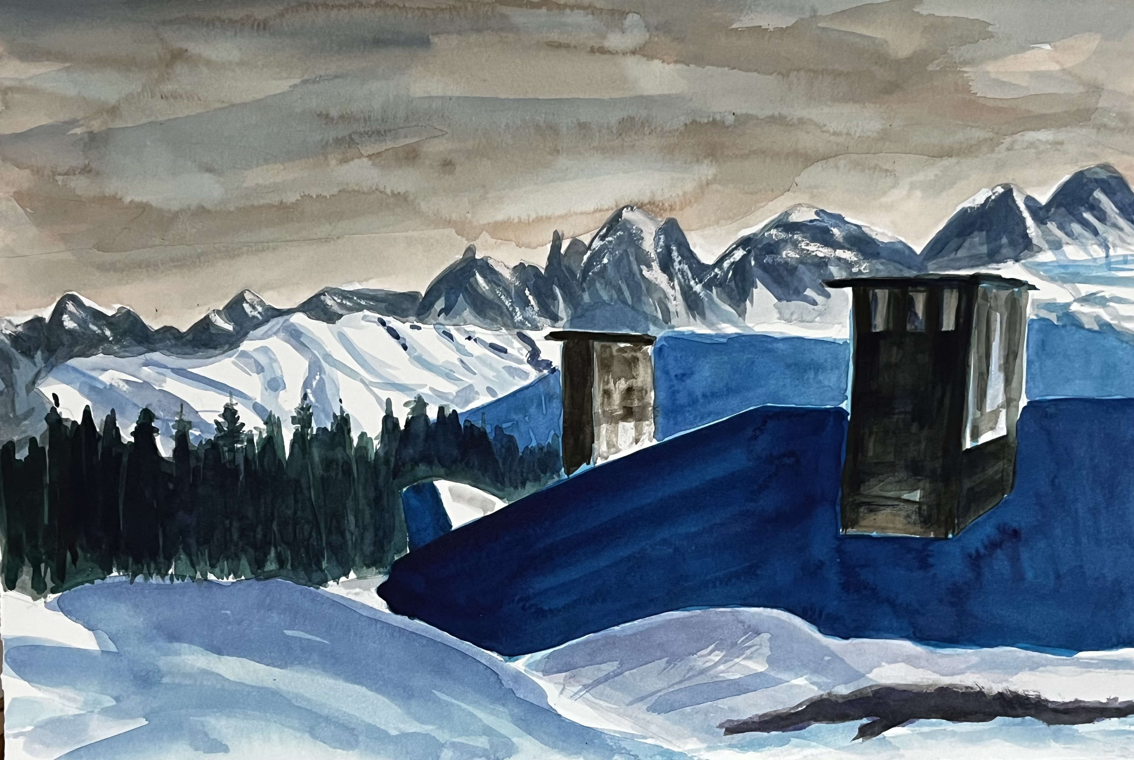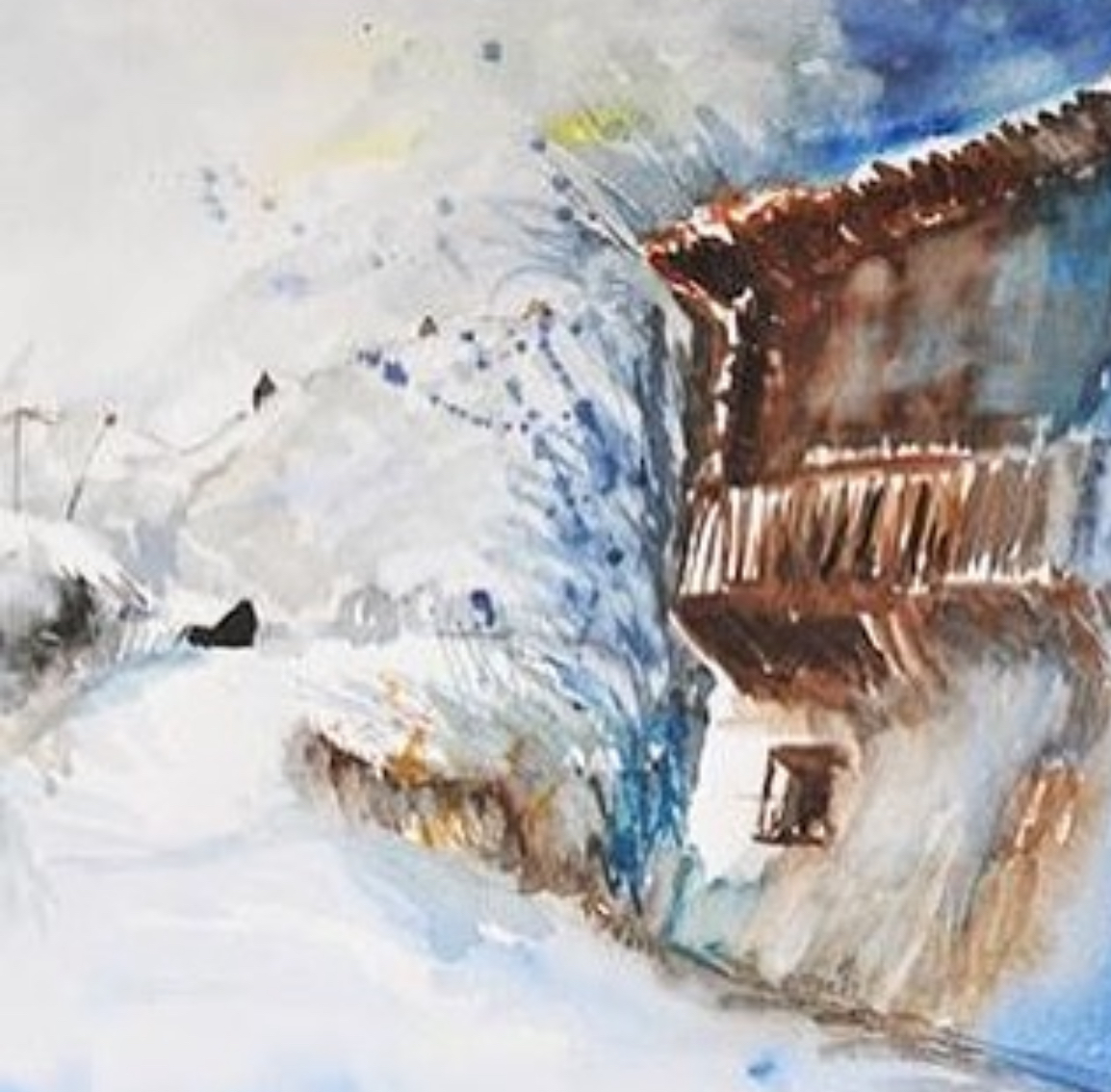 Bauernhof im Winter. Inspiriert von Bernhard Vogel. Aquarellpapier, 40 x 50 cm.