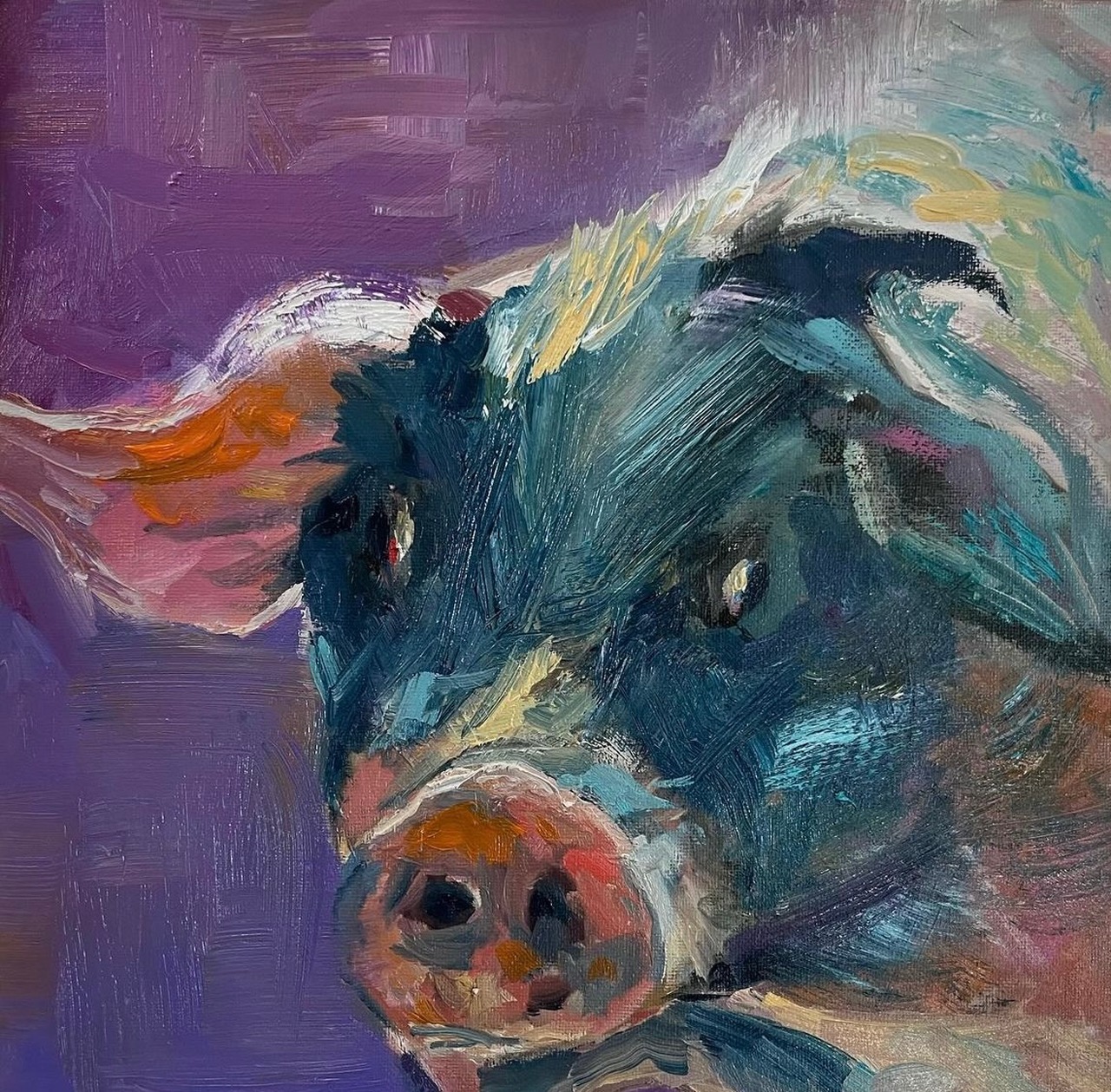 Lila Schwäbisch-Hällisches Schwein. Aus der Serie „Tiere lügen nicht!“ Öl, 30x30 cm, Malplatte
