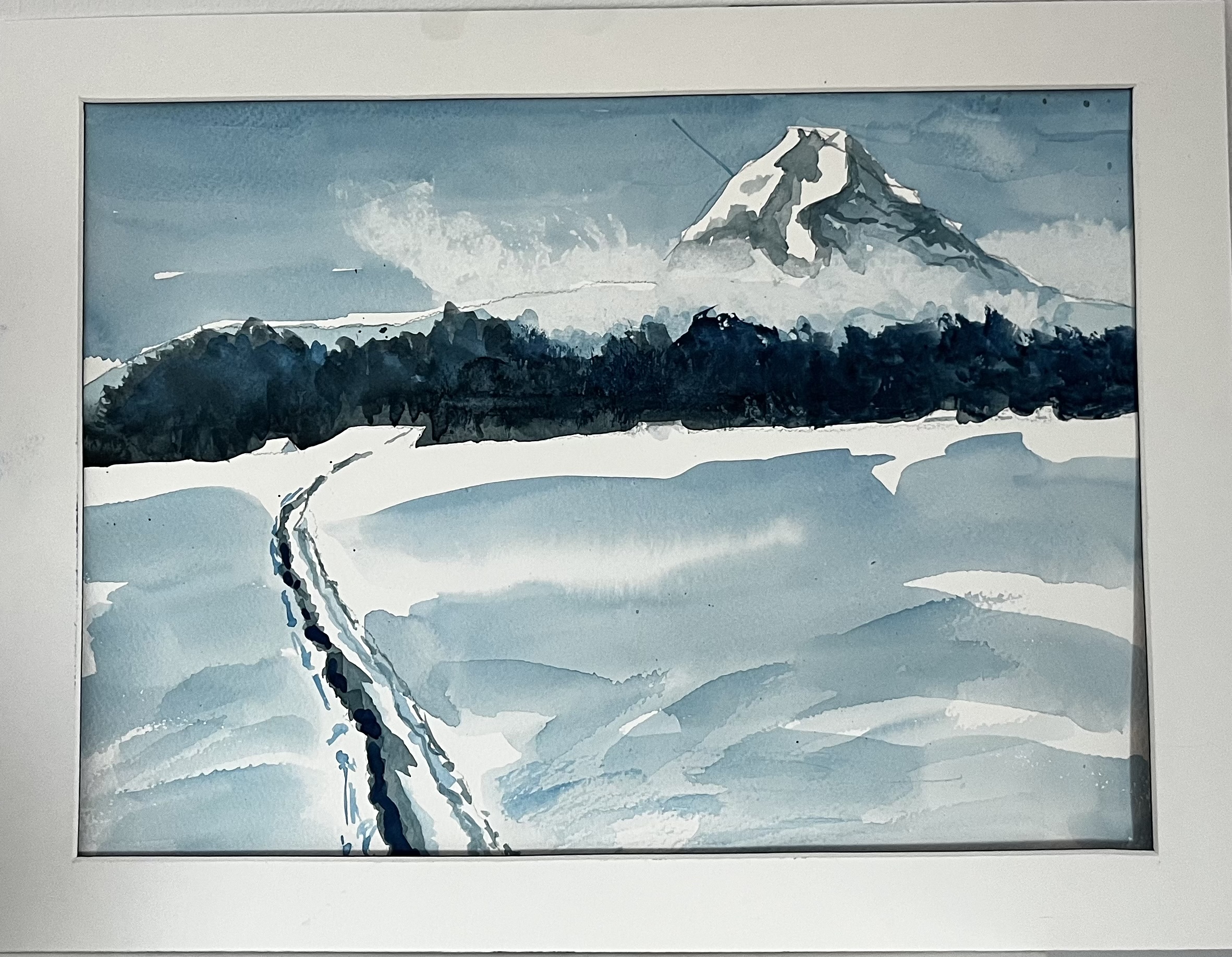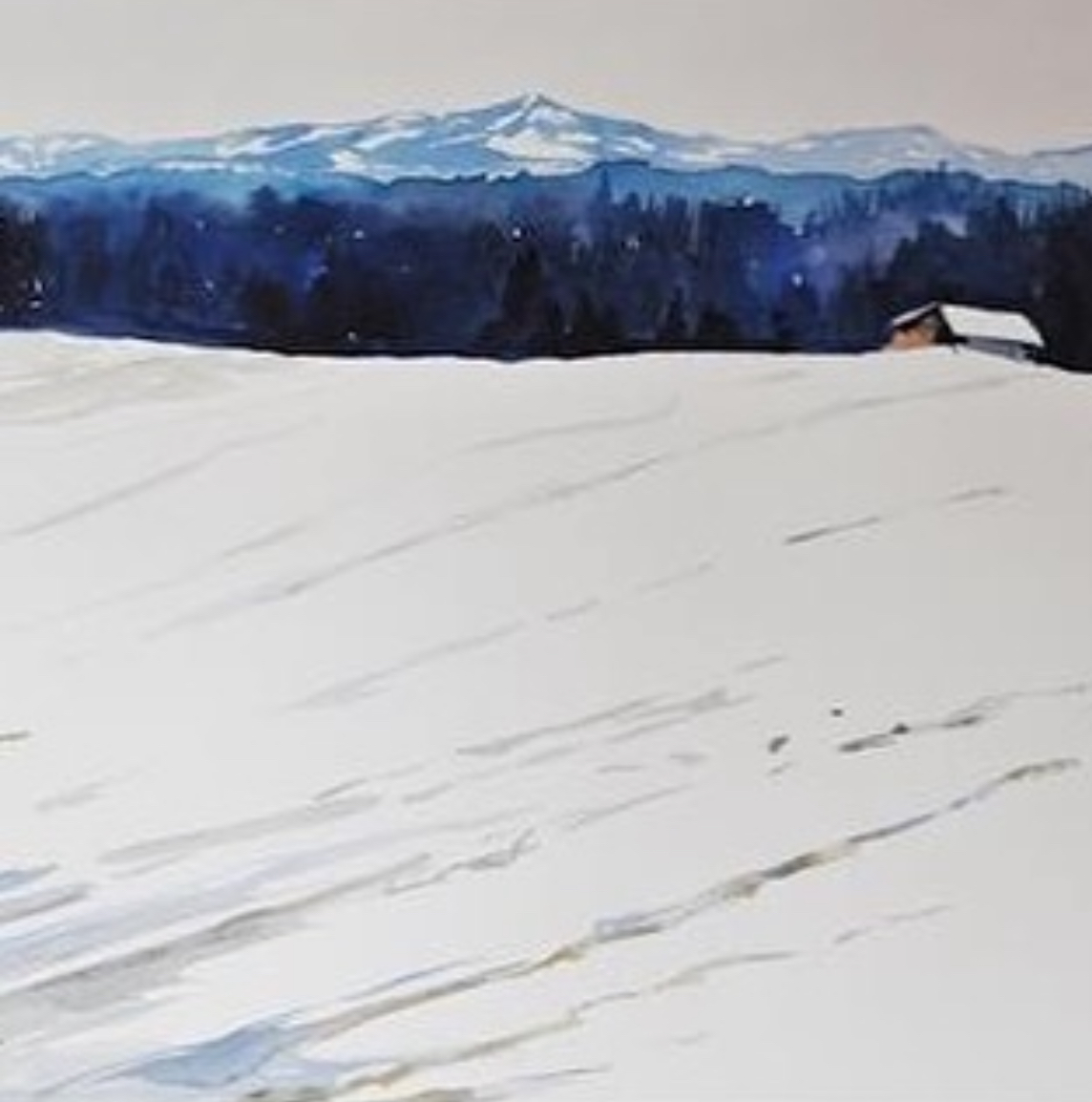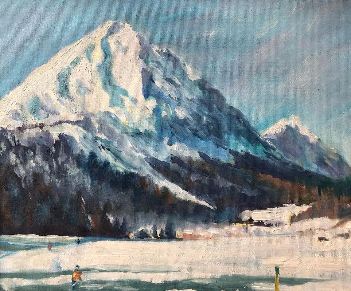 Hier eine kleine Ansicht aus dem Langlauf-Eldorado Leutasch in Österreich. Es zeigt die Hohe Munde, etwas wolkenverhangen. 30 x 40 cm. Der nächste Ölmal-Termin ist am Sonntag, den 26.1.2025 in der VHS Fürstenfeldbruck von 10 - 16 Uhr. Es sind noch Plätze frei. Sie können online reservieren.