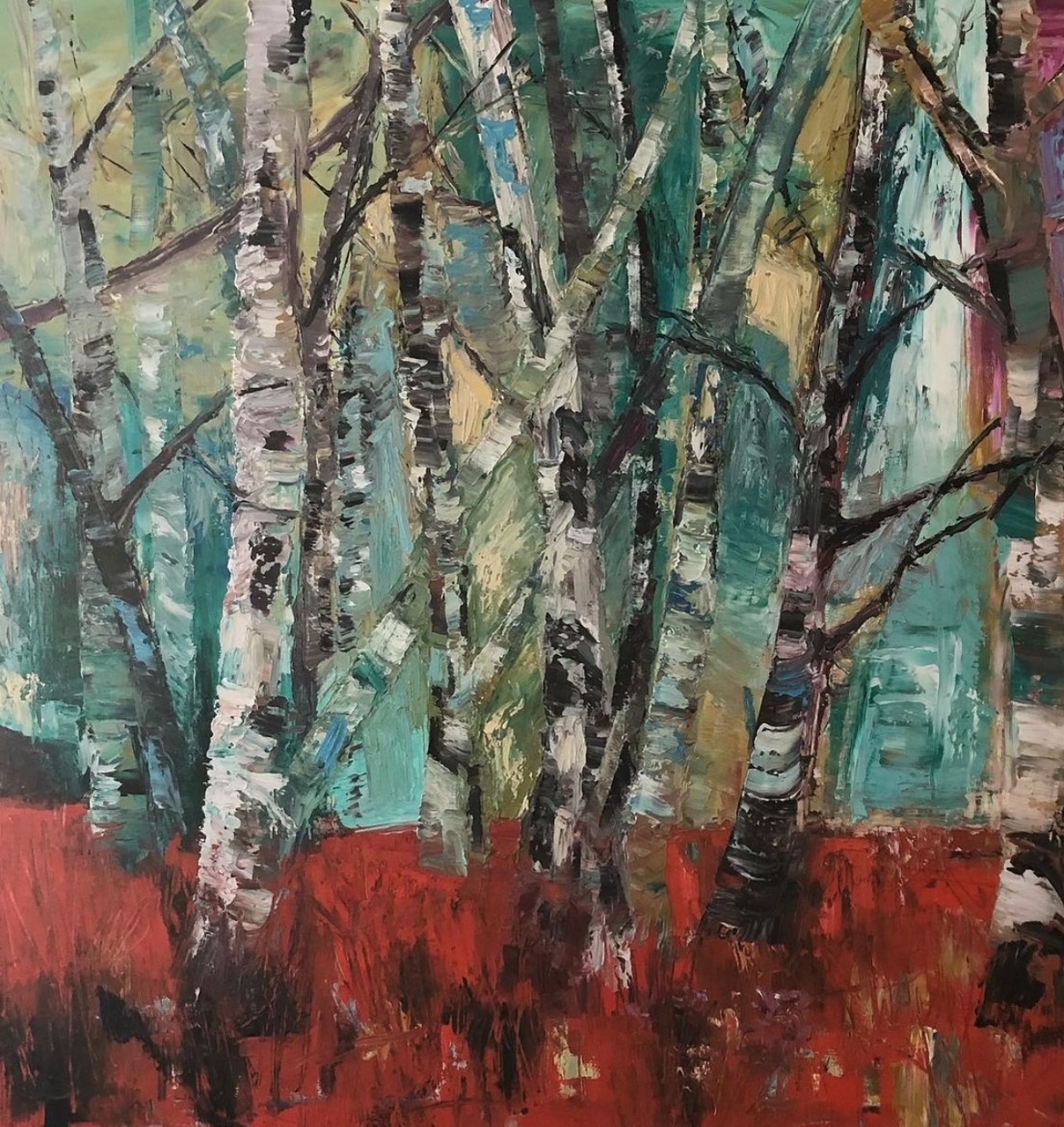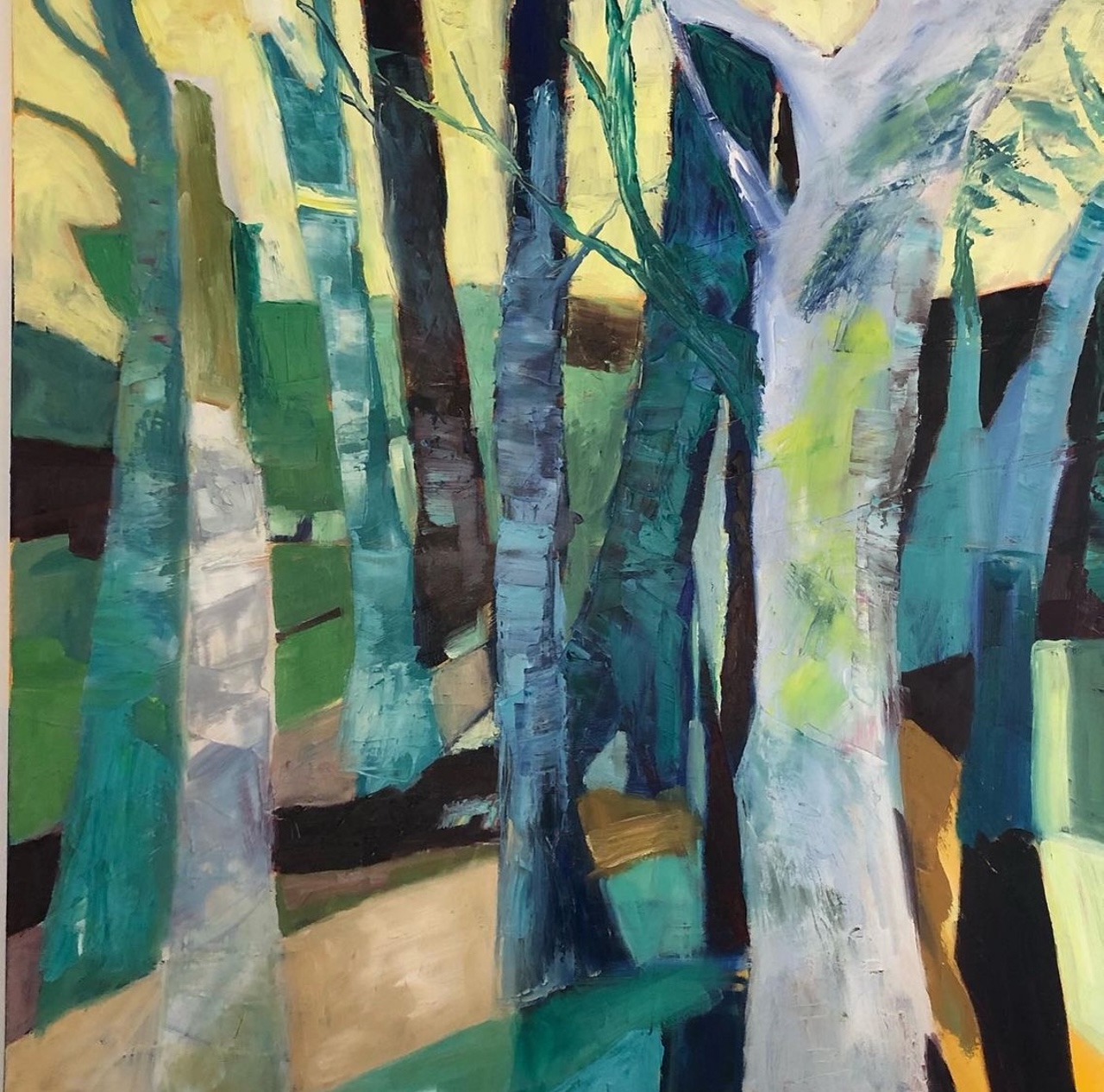 „Ich stehe im Wald. Öl 80 x 80 cm, Keilrahmen. Heutzutage malt man Bäume nicht mehr nur Braun und Grau, sondern ziemlich bunt.