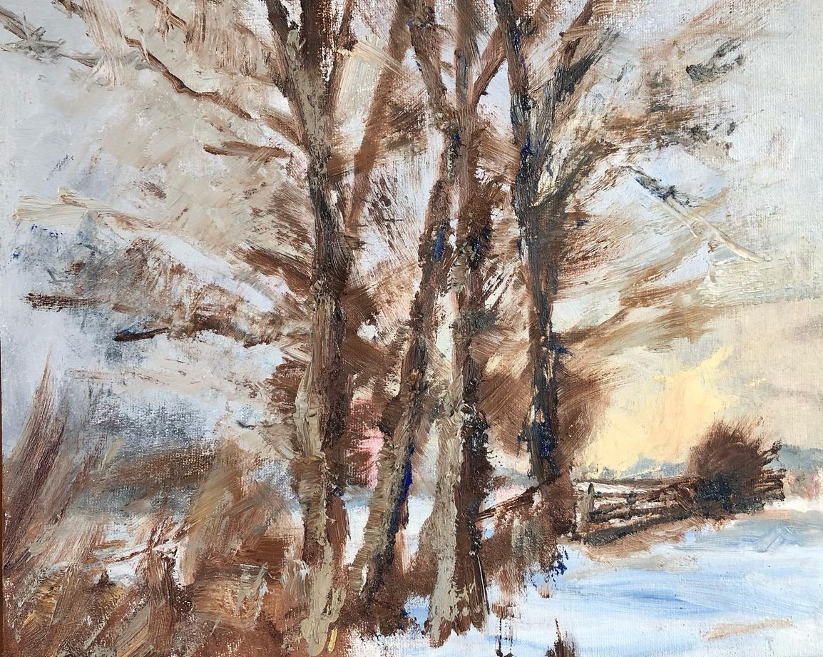 „Norfolk Field in Winter, Vorlage von Edward Seago. 40x60 cm bei Seago. 24x30 cm bei mir, Öl auf Malpappe."