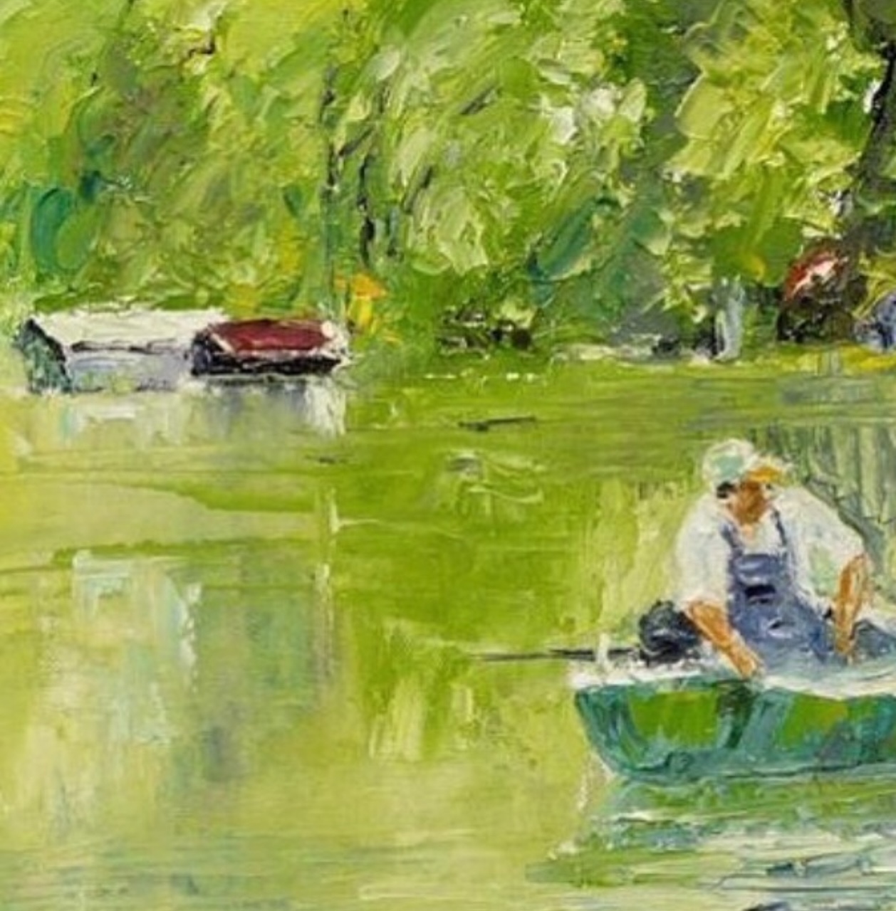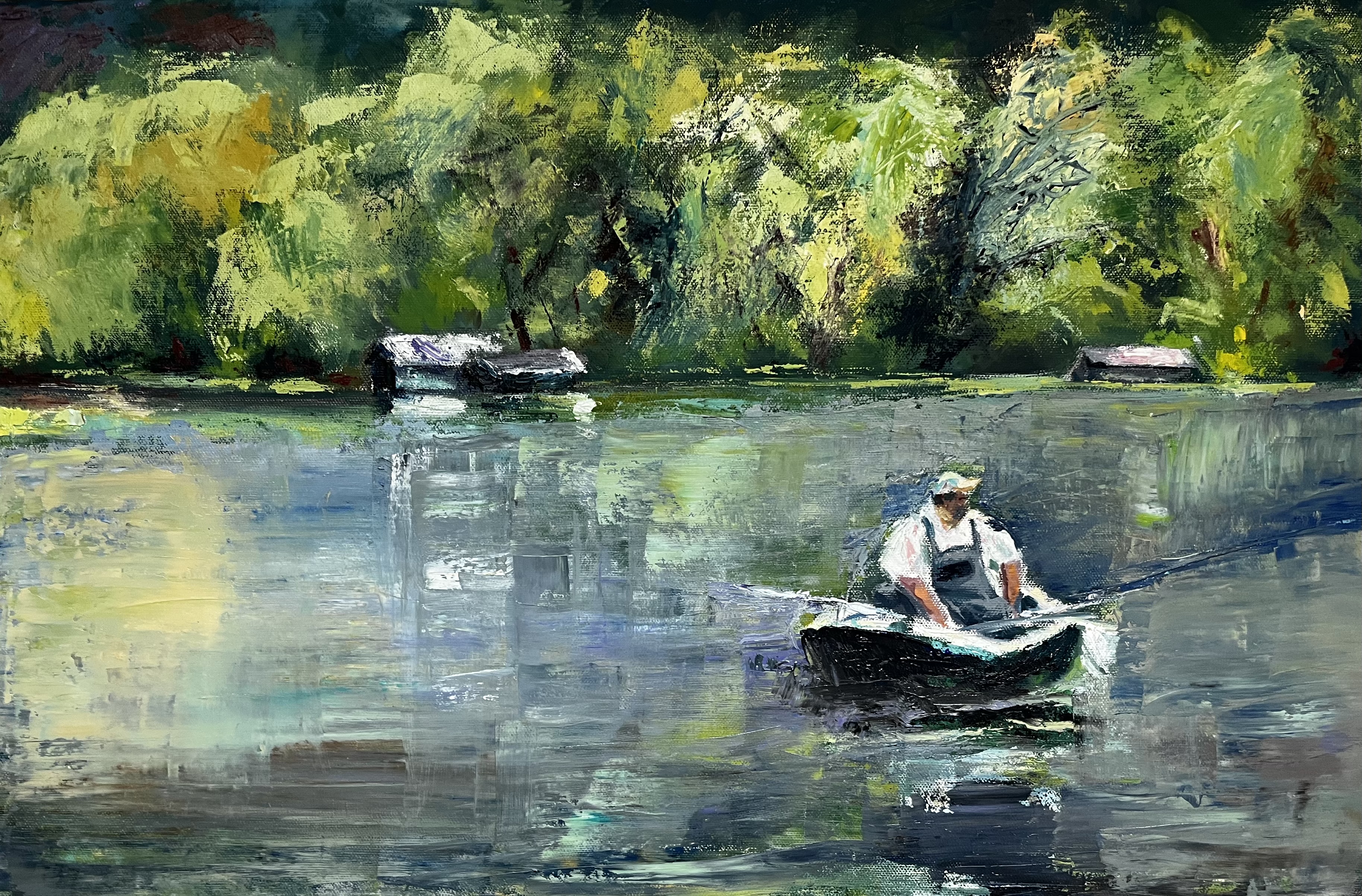 Hier habe ich ein Bild, das ich schon vor Jahren gemalt und im Keller wieder gefunden habe, etwas freundlicher gestaltet. Alles wurde etwas heller übermalt. Das Wasser war auch etwas zu grünlastig. Beim Wasser habe ich auch den Shaper verwendet. Das ist ein Plastikpinsel, der die Farbe gut verstreichen lässt. Das Motiv ist ein Angler im Kochelsee. Keilrahmen, Öl, 60 x 40 cm.