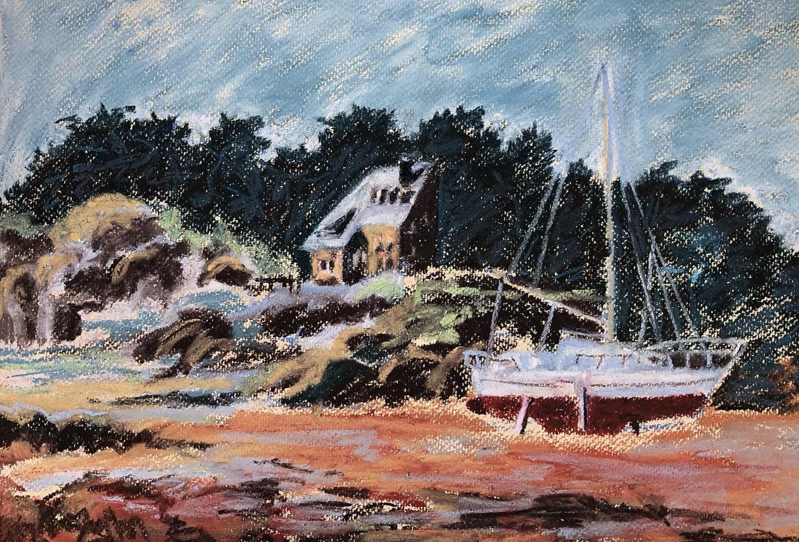 Eine kleine Impression aus der Bretagne. Auf der Ile-Grande.Das Wasser ist sehr zurückgegangen. Mit Pinsel und Spachtel gearbeitet. Öl, 30 x 40 cm, Malplatte.