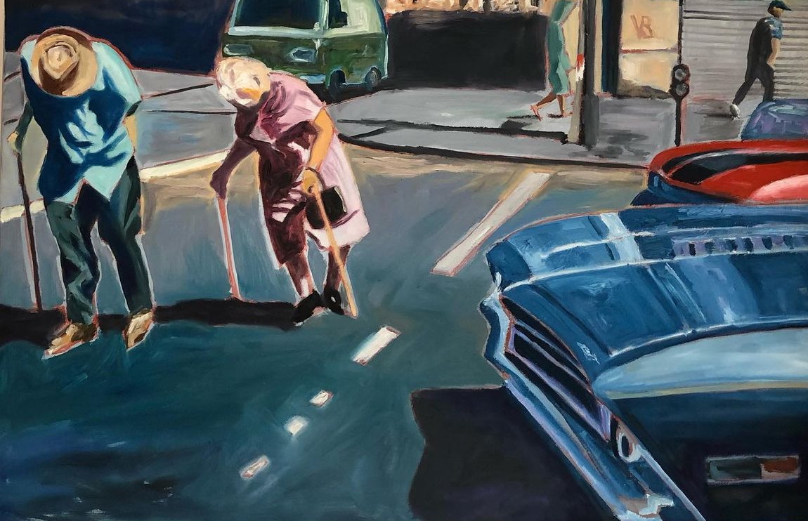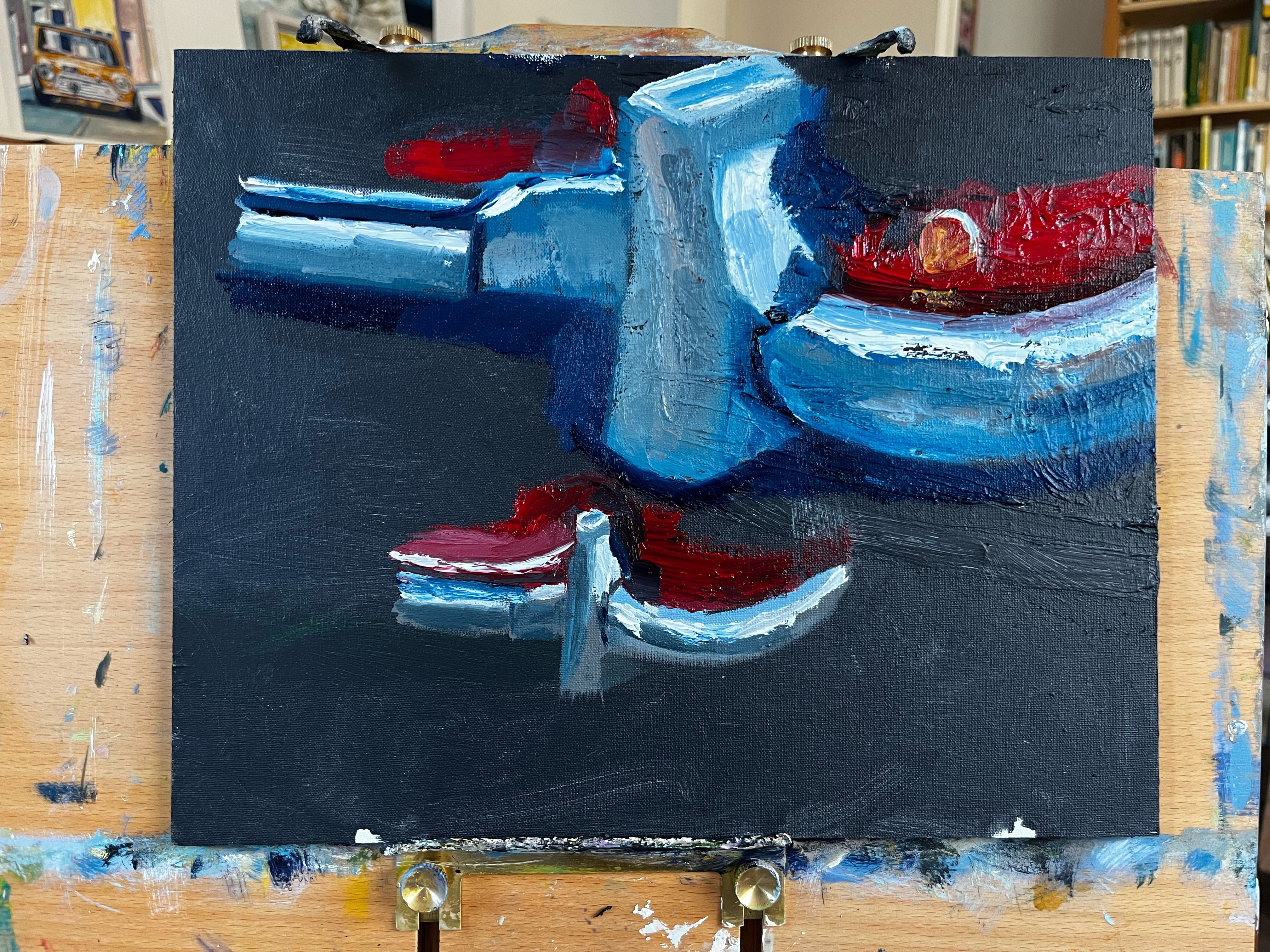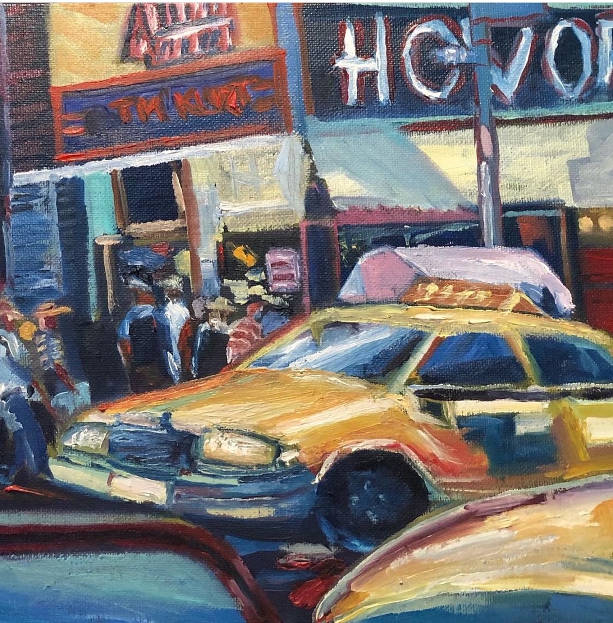 „Taxi is waiting! Teilansicht eines Bilds von Mike Keilbach. Unverkäuflich. 24x30 cm. Öl, Malpappe“.