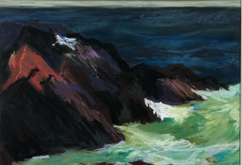 „Diese kleine Küstenansicht wurde in Tennerife mit Softpastell gemalt. Schon etwas länger her. Heute mit Passpartout. Ich will gar nicht verleugnen, dass Edward Hopper Pate stand.“.