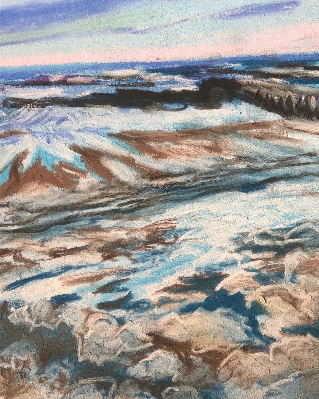Das Original ist nicht so schrill und deutlich heller. Das Foto zum Bild war im VHS-Kurs Softpastell-Malerei in Fürstenfeldbruck sehr beliebt. Es wurden auch sehr gute Ergebnisse erzielt. Die Ansicht zeigt einen Strandabschnitt in der Bretagne. Softpastell DIN A4.