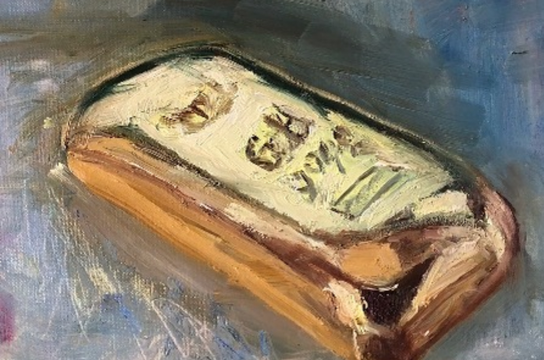 „Ich habe mir einen Goldbarren gemalt. Brauche Geld. War nicht schwer, etwas Zitronengelb, Lichter Ocker, Türkis, Umbra gebrannt und Titanweiss, Öl 30 x 24. Nächstes mal mache ich ihn größer. "