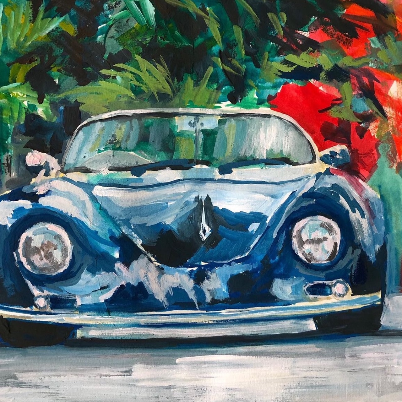 „Oldtimer Porsche, Gouache, 30 x 40 cm, Aquarell-Papier heiß gepresst“.