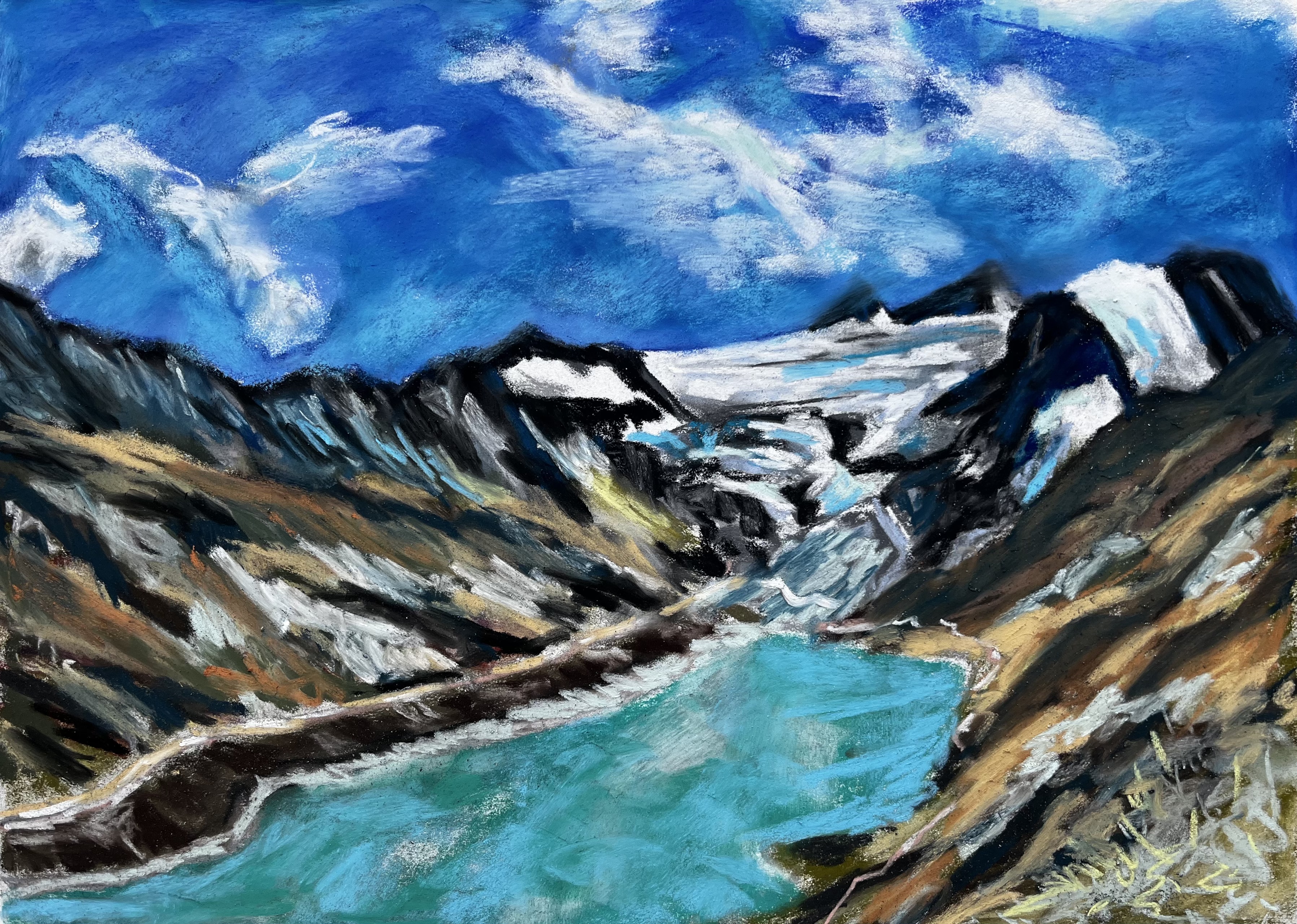 Am Moiry-Staudamm in Anniviers in der Schweiz . Ölpastell, Pastelmat, 30x40 cm. Etwas expressionistisch.