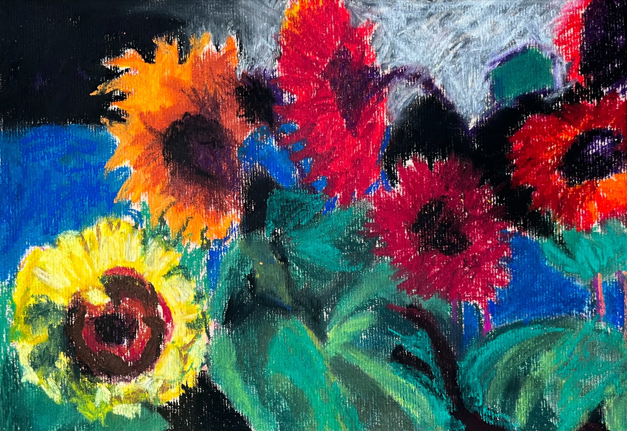Ein Bild mit Sonnenblumen, inspiriert von Emil Nolde. Nolde malte das Bild mit Ölfarben. Ich habe Softpastelle verwendet. Größe: 24x 30 cm. Auf Pastellpapier.