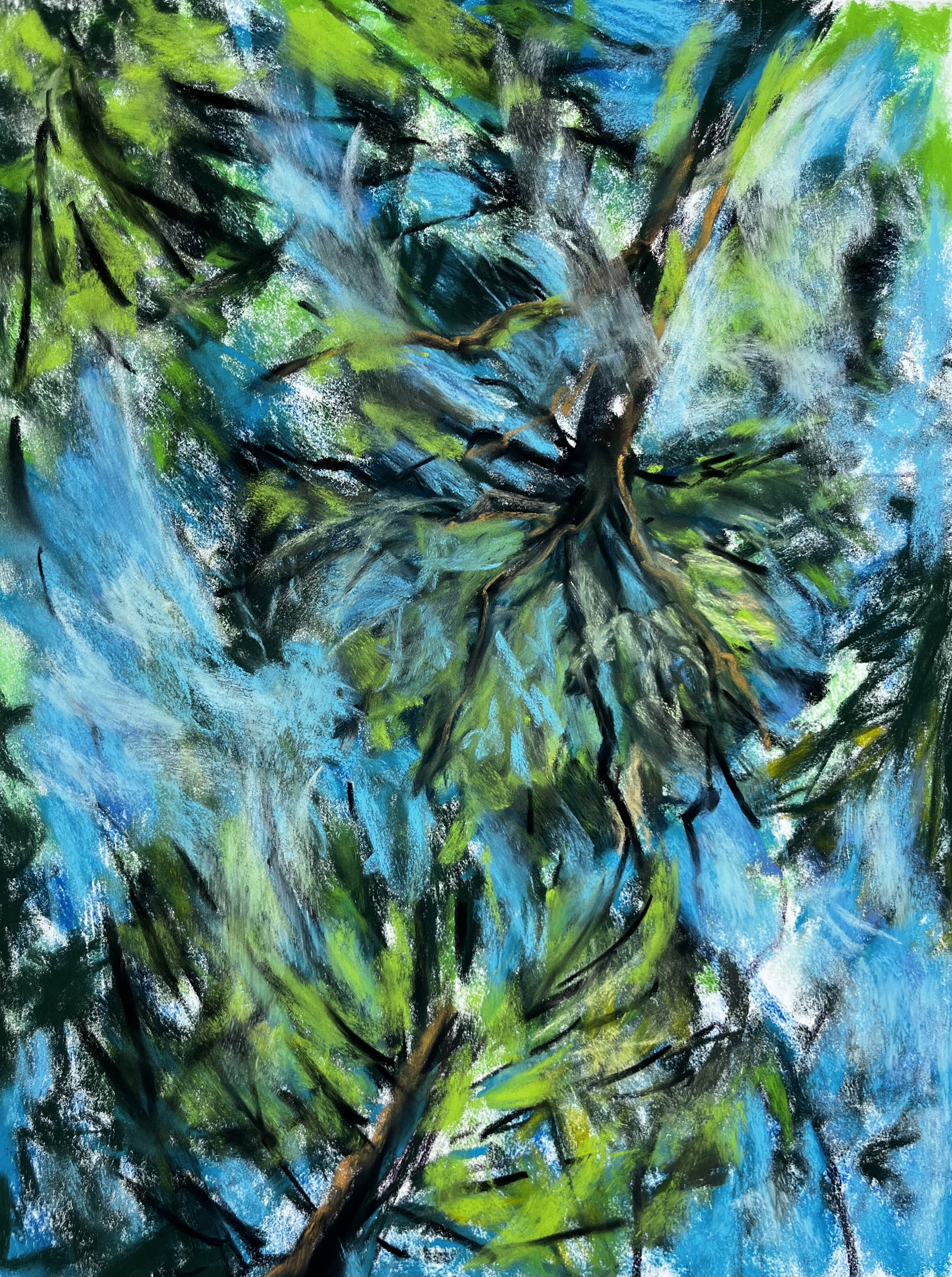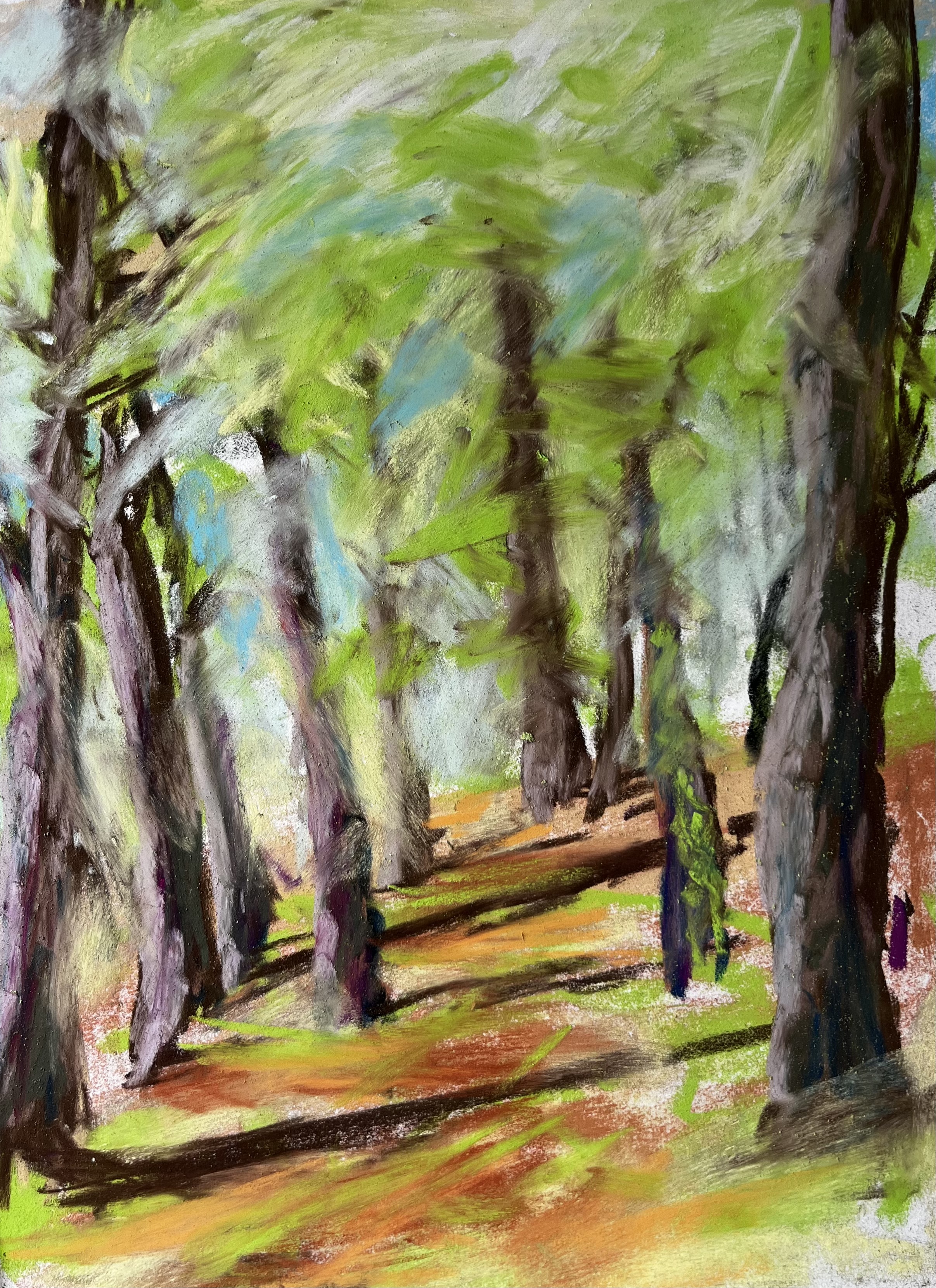 Ein großer Pinienwald bei Carcans Plage. In der Nähe von Bordeaux in Frankreich. Falls es bei Ihnen leichte Schwindelgefühle hervorruft, ist es gelungen! Softpastell, Pastelmat, 30 x 40 cm.