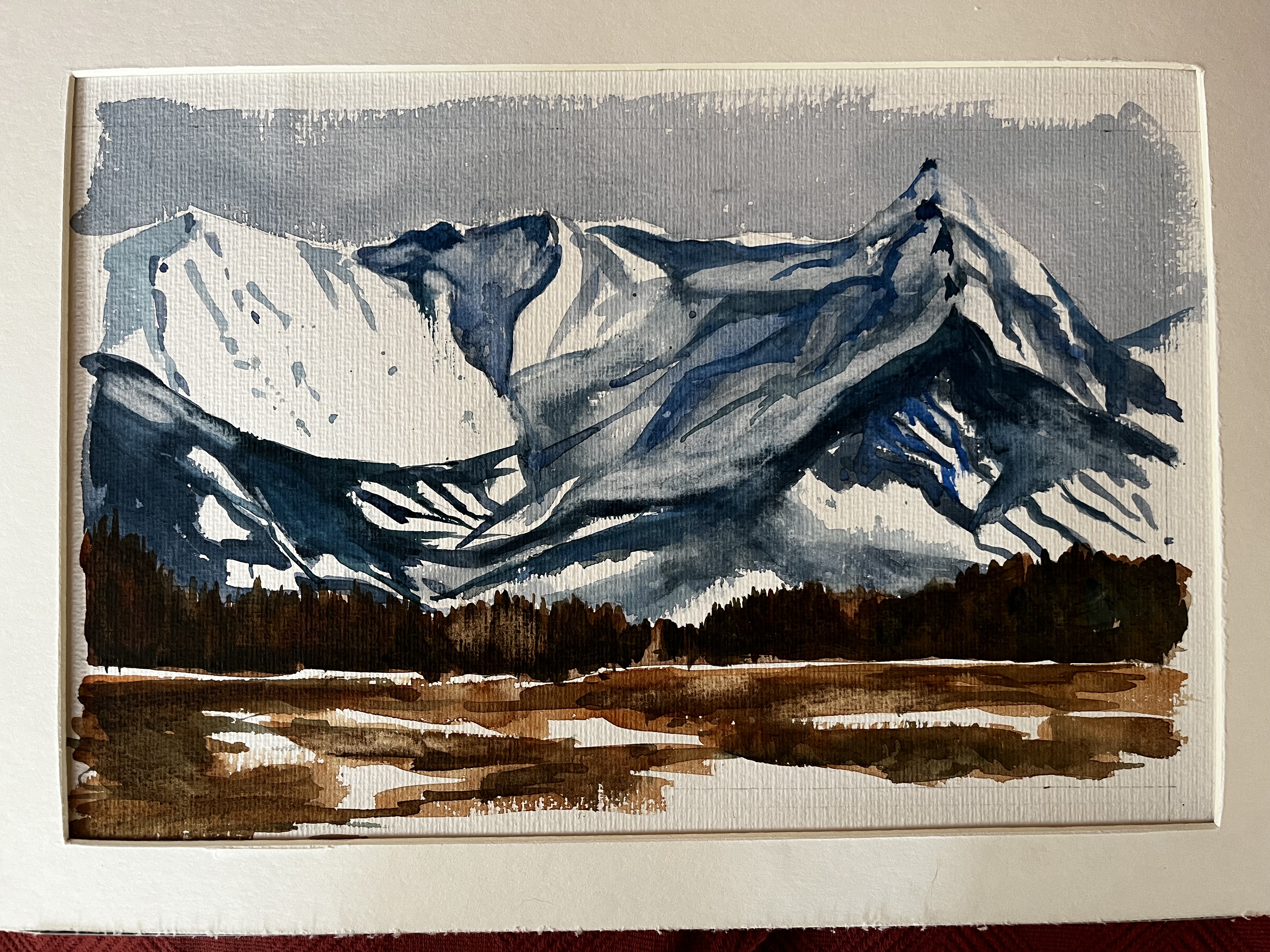 Dieses Bild ist eine Ansicht mit Bergen und Moor im Vordergrund. Es ist ein einfacheres Aquarell, das viel Licht beinhaltet. 30 x 40 cm. Es kommt hier ein bisschen zu dunkel raus. Satiniertes Papier. Mit Passepartout. Die unregelmäßigen Ränder des Aquarells sind kein Fehler. Man malt bei Aquarellen nicht bis zum Papierrand, da dies zeigt, dass die Malerei planmäßig verlaufen ist und nicht einfach Seitenränder abgeschnitten wurden, die man vielleicht „versaut“ hat. Man muss es nicht unbedingt so zeigen, wie hier. Wenn das Passepartout jedoch weggenommen wird, dann sollte noch rundum ein weißer Rand zu sehen sein. Oft wird das Bild zugeschnitten. Wenn dann noch ein passables Bild herauskommt ist es ja letztlich auch egal.