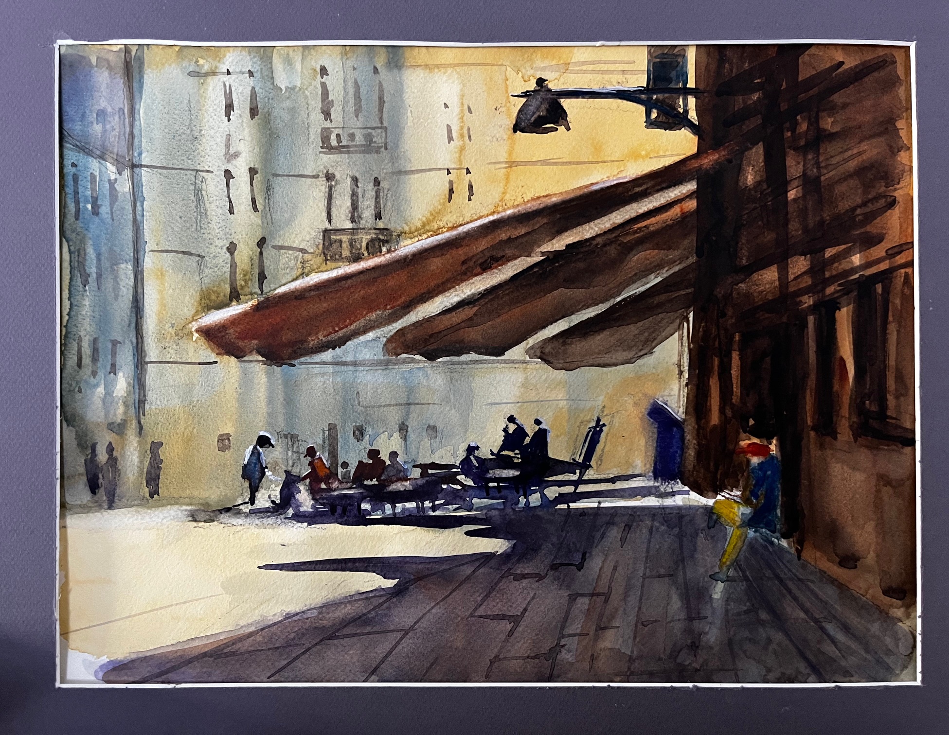 Aus der Serie "Hauptsache der Hund ist dabei!" Eine kleine Cafe'-Szene in Venedig. Das Original ist von Gary Tucker, ein sehr guter amerikanischer Maler. Mein Aquarell hat die Größe 30 x 40 cm. 320 Gramm/qm. Die Sonnensegel sind tatsächlich so lang. Mit dunkelgrauem Passepartout. In Zukunft wieder 640 Gramm/qm, dann wellt sich nichts!