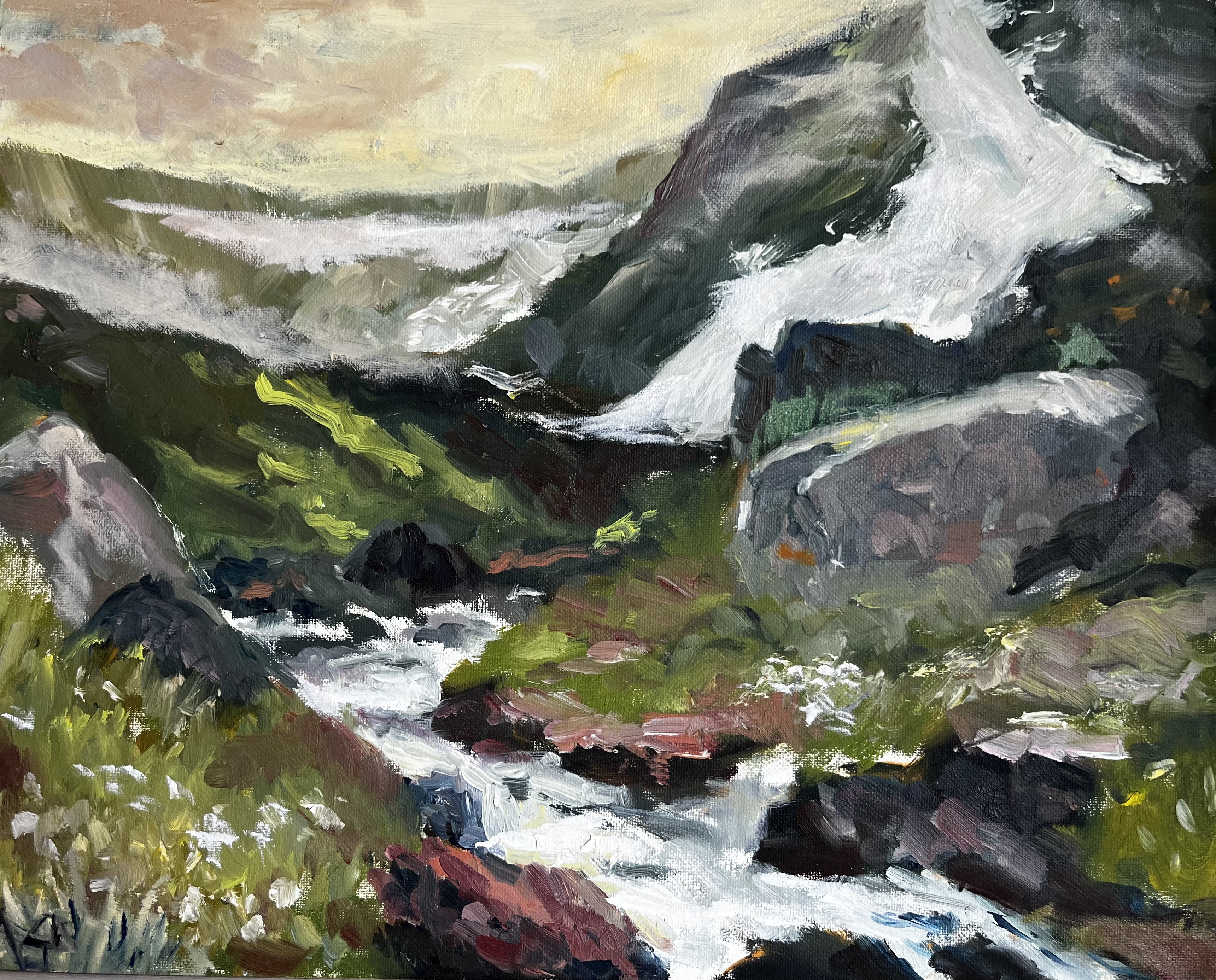 Das Bild "Gletscherbach im Morgenlicht" passt in jedem "Herrgottswinkel". 24x30 cm, Öl auf Malpappe. Macht sich gut mit grauem Schattenfugenrahmen.
